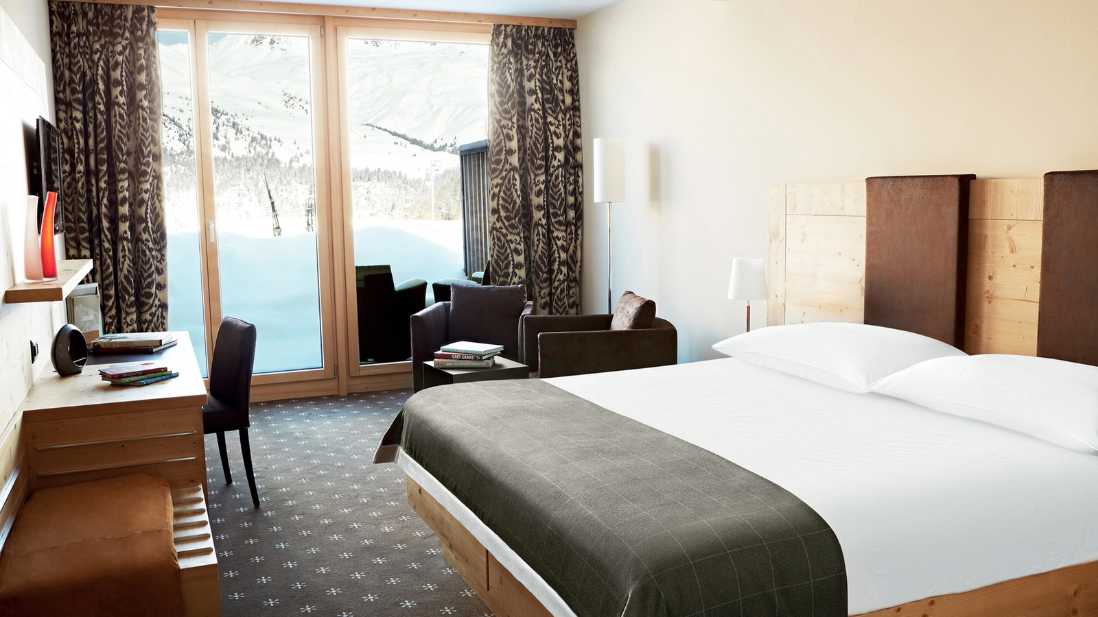 All of the 70 rooms and suites feature large terraces or balconies with panoramic windows overlooking the Engadin mountains.