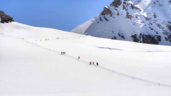 Well-known Jungfraujoch is an alpine viewing point located between the Mönch and Jungfrau mountains. To reach here, take the cog train from Grindelwald to Europe’s highest train station. At a spectacular 3,545 metres tall, this hilltop station offers sweeping views over the surrounding mountains. For a different vantage point, climbers can hike across the glacier to the Mönchsjoch hut alongside a private guide before returning to Grindelwald via train.