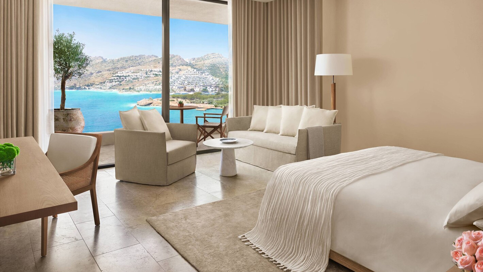 The focal point of the hotel, a grand structure of marble and glass, looks out over the grounds, boasting supreme vistas of the white stretch of sand below. Branching out from this building, the guestrooms, lofts and villas, linked by paths, draw on soft tones and light woods, as well as marble bathrooms, with gaping tubs, to create tranquil interiors. Most of the accommodation has views of the Aegean Sea, and upgraded suites encompass kitchens and patios, with plunge pools.