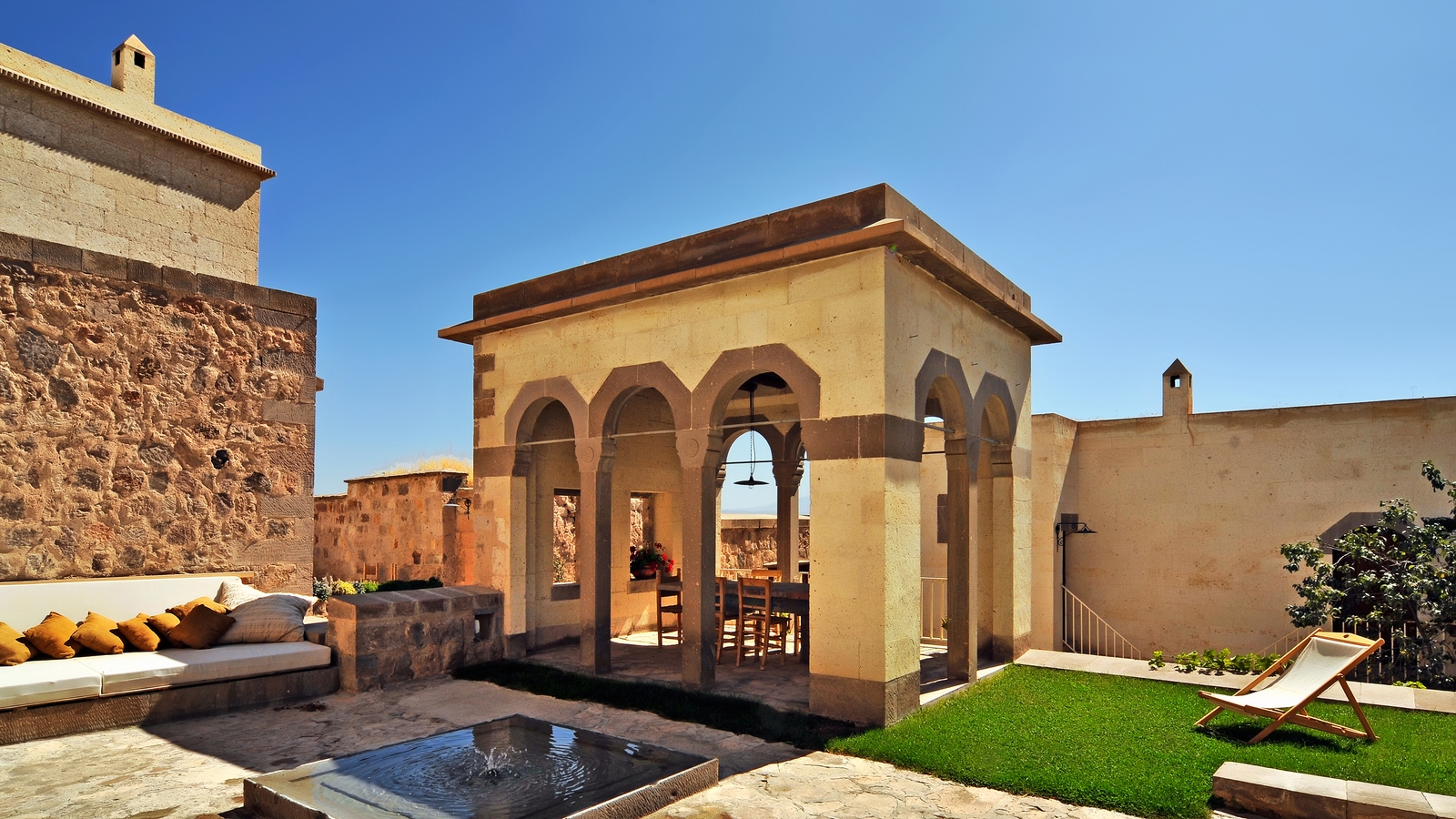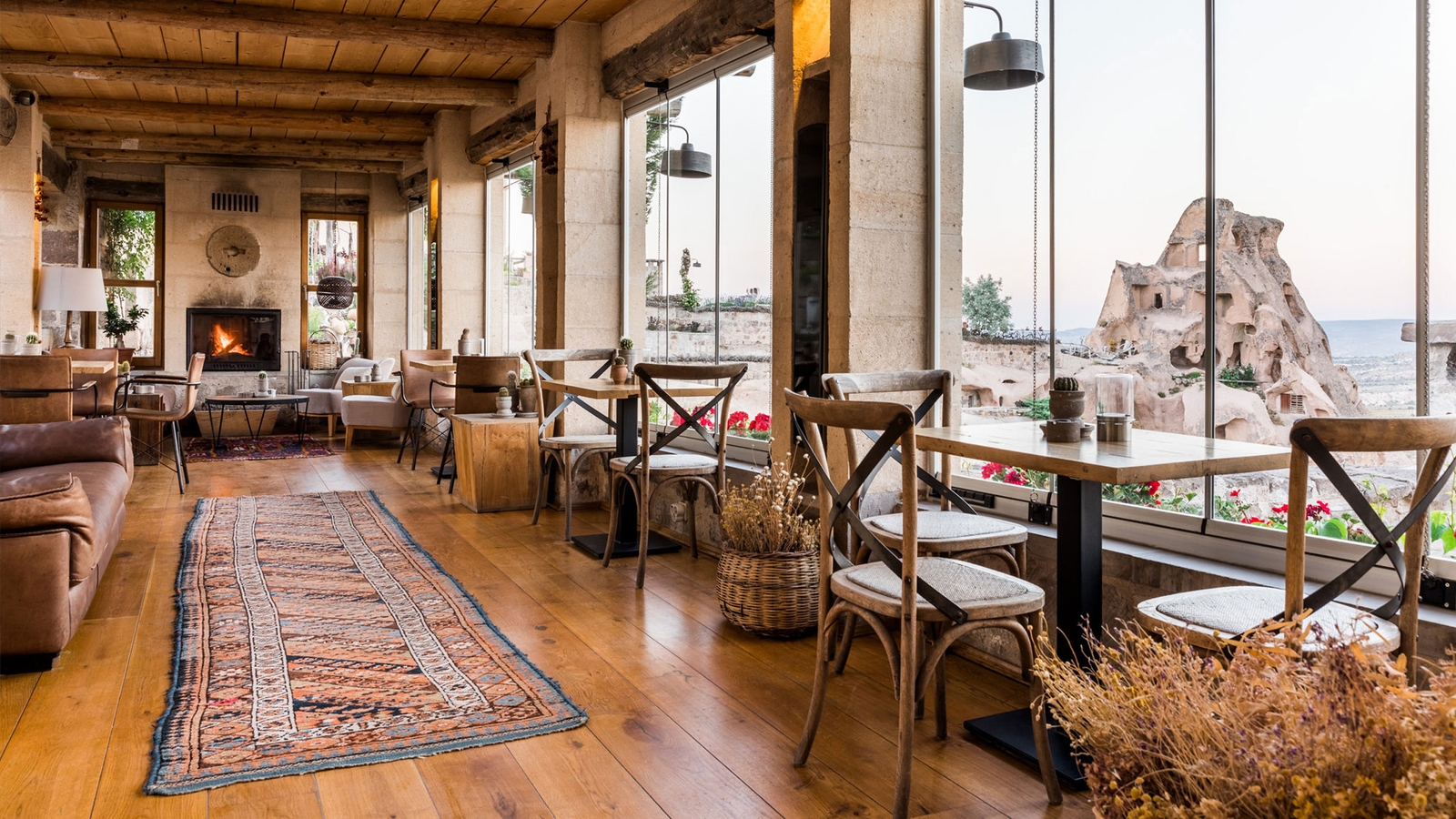 Dining is experienced on an outdoor terrace, jutting out over Pigeon Valley, and a menu of Turkish delicacies with Mediterranean flavors is on offer. A buffet breakfast is served every morning, and guests can unwind with snacks and drinks in the snug lounge by the fire. It’s also possible to sample the region’s finest wines in the vast wine cellar, dating back thousands of years and storing more than 22,000 bottles.