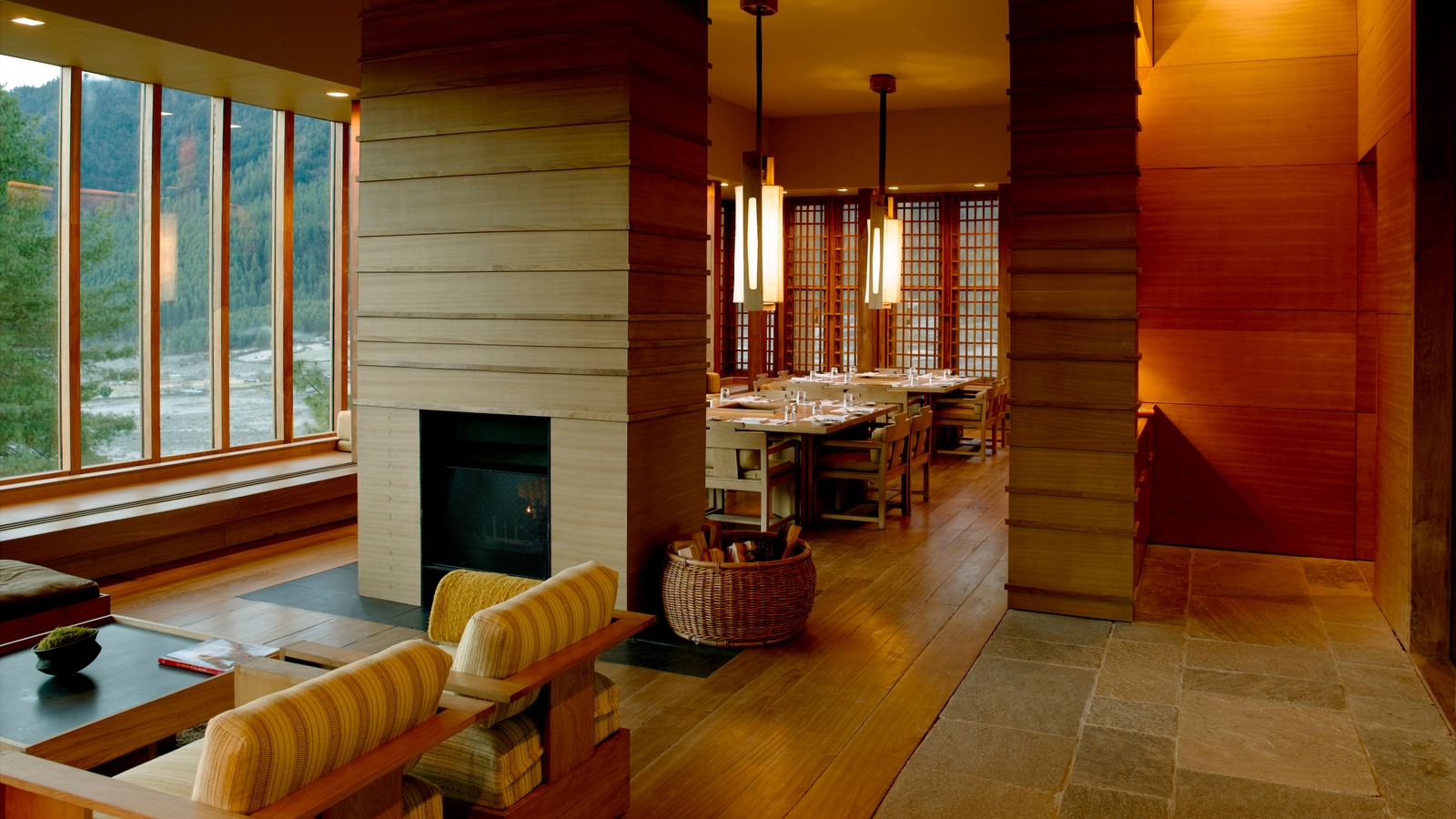 Cosy chairs, sofas and family-style dining tables appoint the lounge which features floor-to-ceiling windows for breath taking views over the valley and surrounding mountains. Spa facilities with private treatment rooms can be found on the lodge’s ground floor.