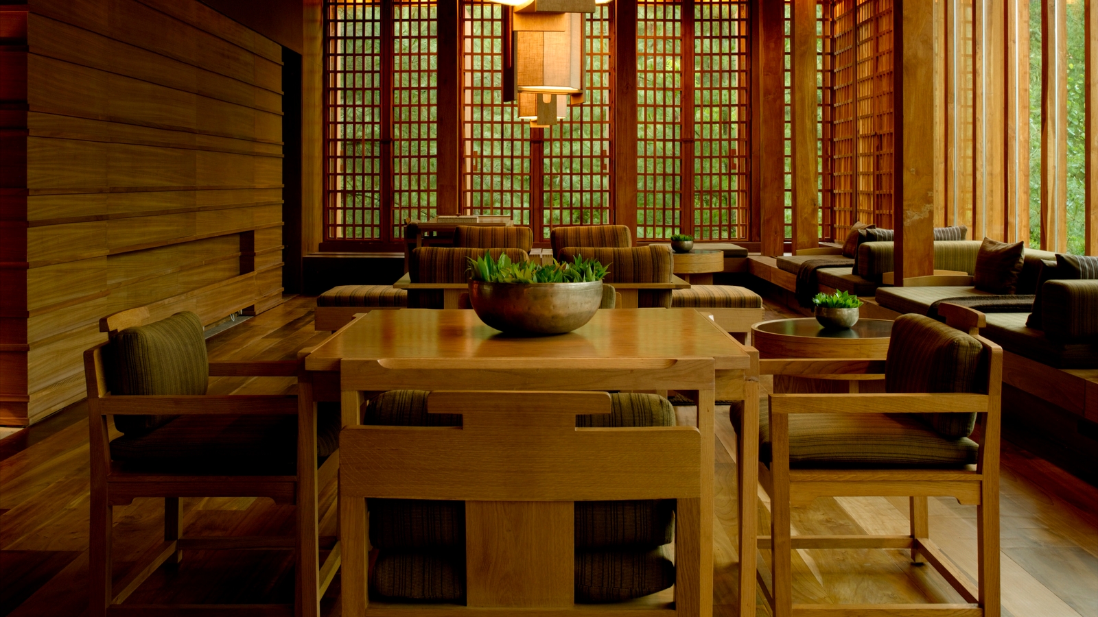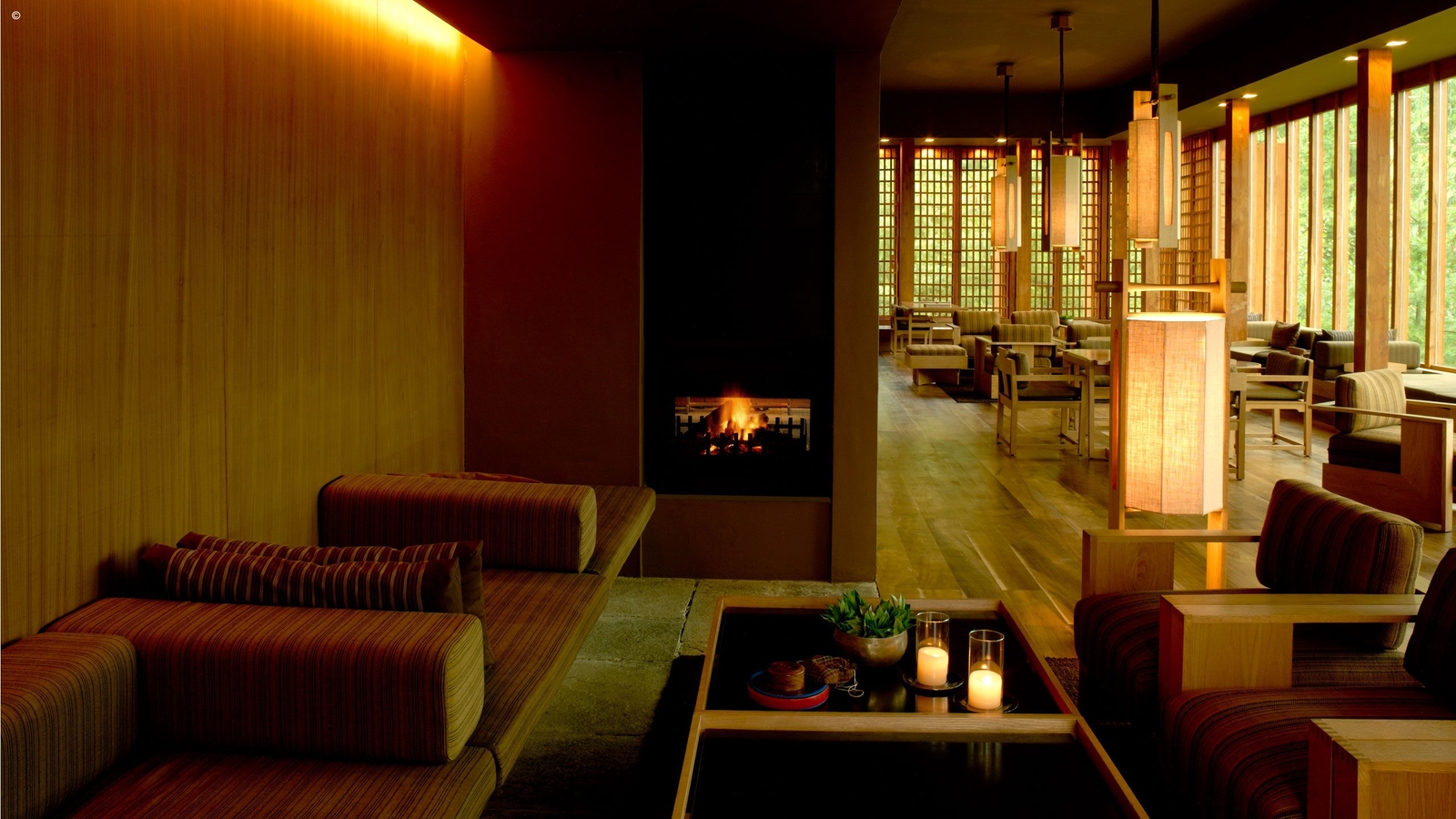 This impressive lodge features 24 suites, each with a combined lounge and bedroom and traditional wood-burning stove. Centred by a large flagstone courtyard, a lime-washed stone pavilion houses the living and dining room facilities with floor-to-ceiling windows, a library and an outdoor terrace overlooking a small stream.