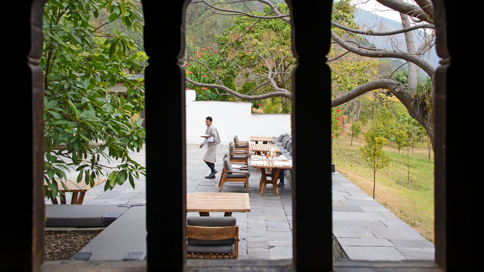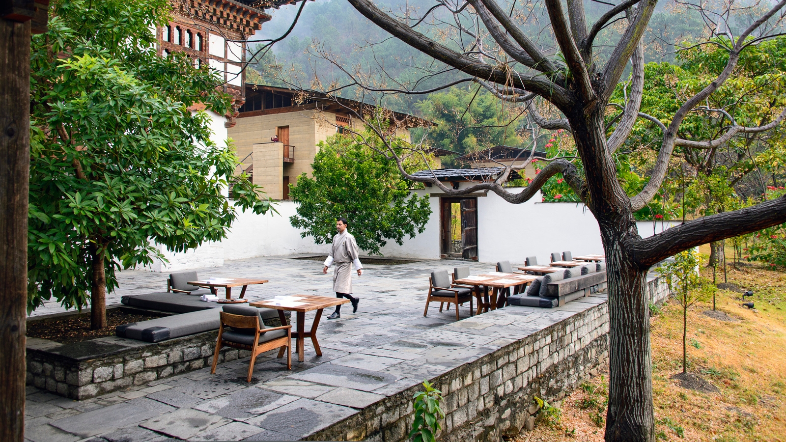 Dining, pampering and adventure are all well catered for, from the communal dining room, tea pavilion and alfresco courtyard to the two-story spa and meditation room, to exciting white-water-rafting tours.