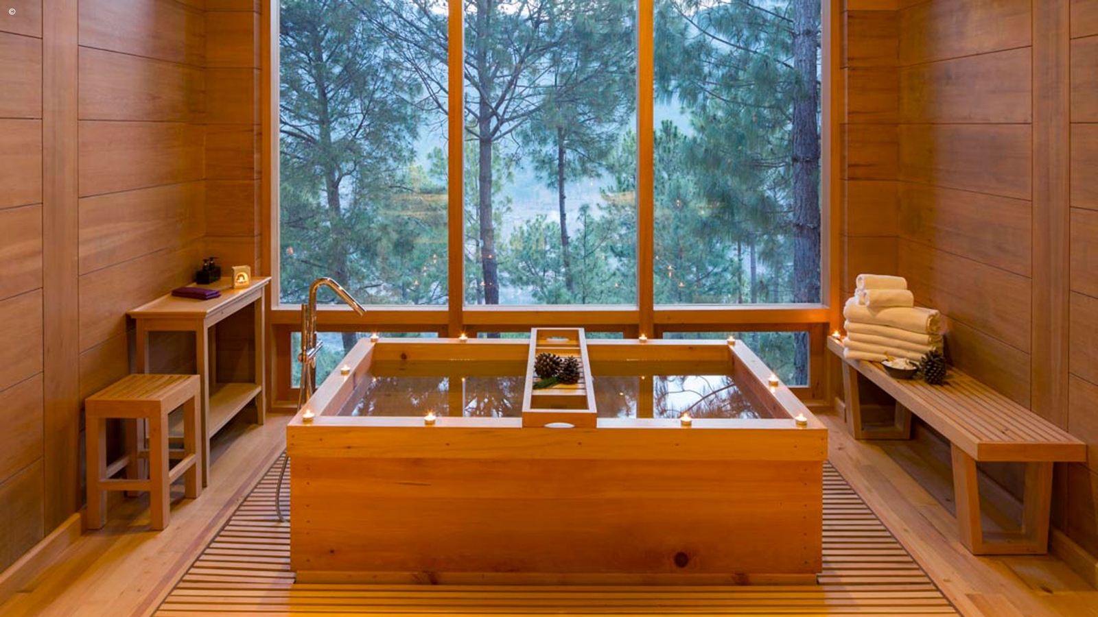 The spa is uniquely equipped with an outdoor wood-fired bath as well as a steam room and a sauna with a window overlooking the forestry. Treatments use hand-blended oils for the ultimate in revival.