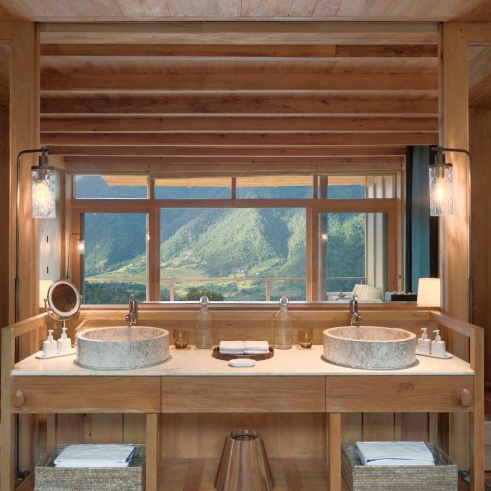 The communal areas of the lodge include the living room and lounge and the exceptional Ari restaurant that serves up inspired cuisine, influenced by both international and Bhutanese flavours. The restaurant is situated indoors but there’s also an outside dining area where fires burn late into the night so that guests can spend the evenings under the stars. The Six Senses spa and wellness centre is a haven of rejuvenation and relaxation. There are three treatment rooms, a gym, two meditation huts and yoga facilities. The outside heated pool, curved and raised is a wonderful place to relax or enjoy some exercise with stunning views.