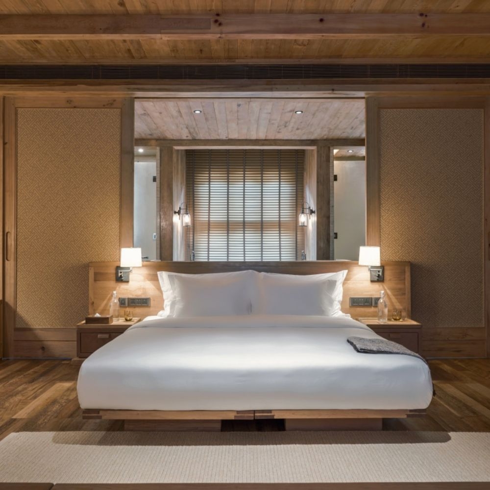 The Punakha Six Senses, affectionately known as the Flying Farmhouse sits high on the hillside, the raised building overlooking the valley, pine forests, streams and fluttering prayer flags below. This is a truly beautiful lodge that harnesses a rustic charm, echoing its rural surroundings. The main building of the hotel is built of sandstone, flagstone floors, grey tiled pitched roofs and wooden beams. Inside the contemporary design is simple yet welcoming. Large picture windows bring the outside, inside and the warm tones of the wood panelled walls and wooden furniture give a welcoming feeling.