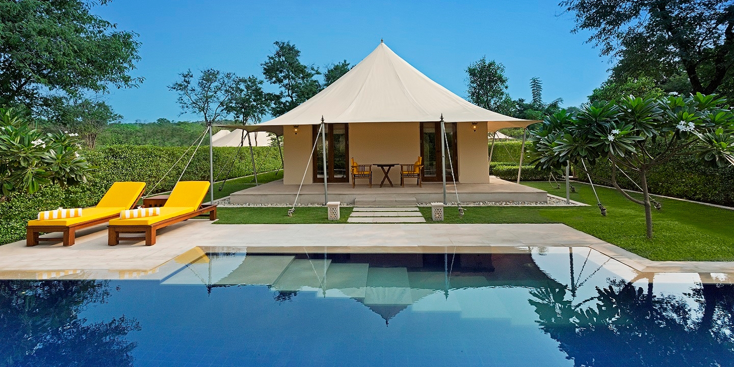 The resort combines traditional Rajput and Mughal architectural elements with beautiful gardens and modern touches. Accommodation ranges from private villas to opulent tents, some with a private pool, and luxury rooms. All rooms, tents and villas are exquisitely adorned, with hand crafted, traditional design features, and many enjoy forest views.