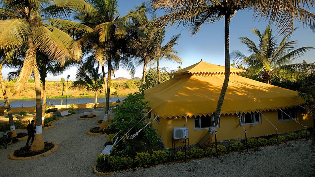 21 tents large tents are spacious and comfortable with en suite bathrooms and air conditioning, strung out along a path under shade of trees. Overlooking the river, the restaurant serves a choice of Indian, Chinese and Continental food and picnics in scenic locations nearby can be arranged.
