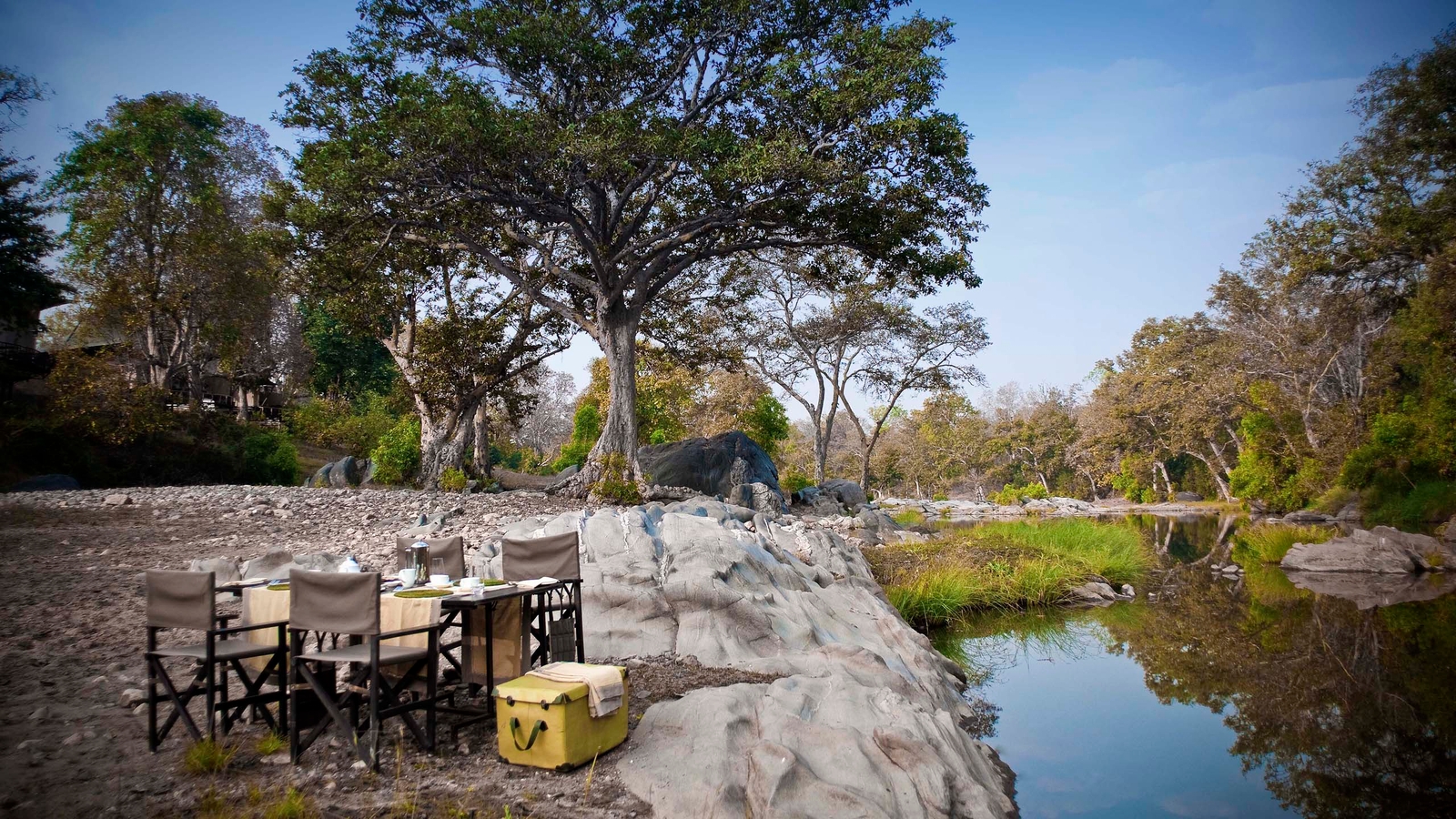 Overlooking the heart Kanha Tiger Reserve from the banks of the Banjaar River, Banjaar Tola is an African-style luxury safari camp with a dash of chic modern style twinned with local touches such as Bastar tribal artwork, hand-crafted furniture and rich block-printed Madhya Pradesh fabrics.
