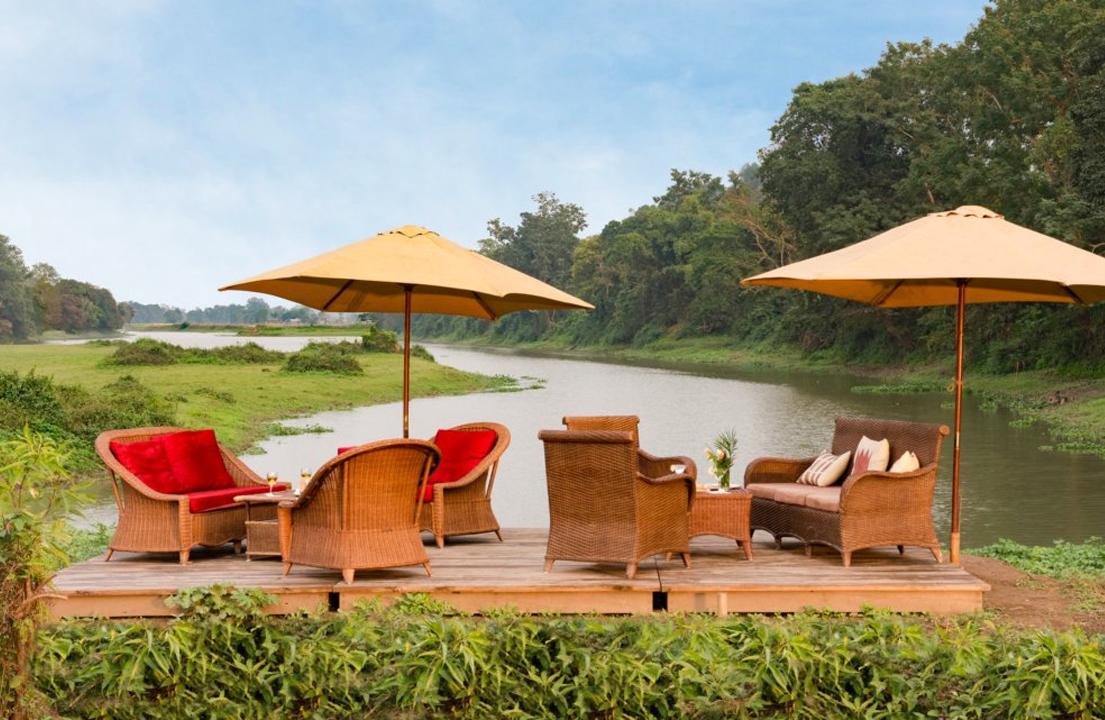 The lodge’s charming common area, known as ‘Machan’ (jungle platform), is a raised, air-conditioned river-side space. It serves as both a sitting and dining area, opening onto two verandahs. The larger space, with its high thatched ceiling, wooden flooring and well-equipped bar, offers stunning views of the river and the national park, making it an ideal spot for birdwatching or scanning the banks for wildlife. The smaller verandah overlooks meticulously tended farmland, providing a perfect setting for al fresco breakfasts.