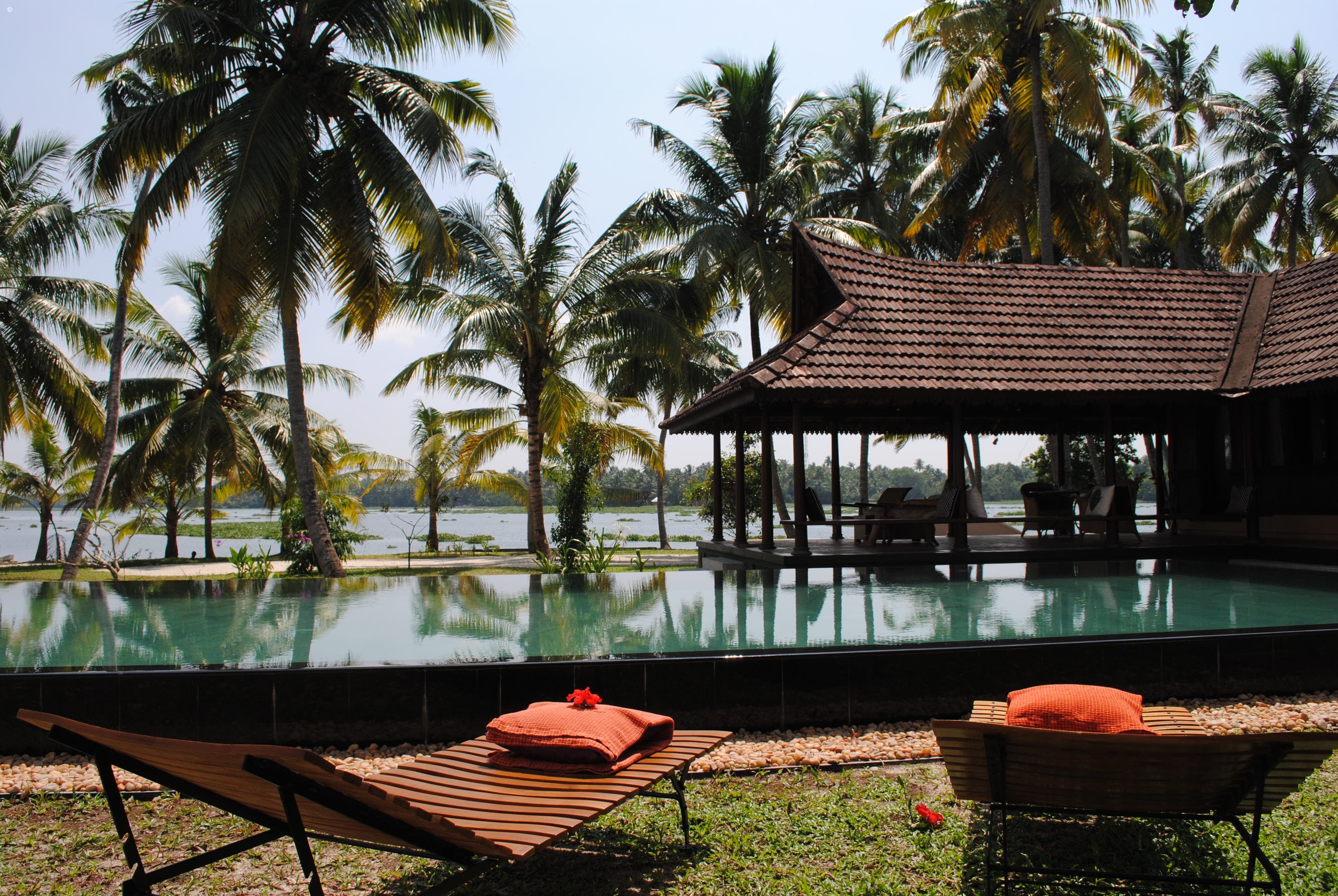 The property is surrounded by typically lush Keralan gardens and features an expansive granite swimming pool and peaceful coconut grove with hammocks to soak up serene views across the lake.