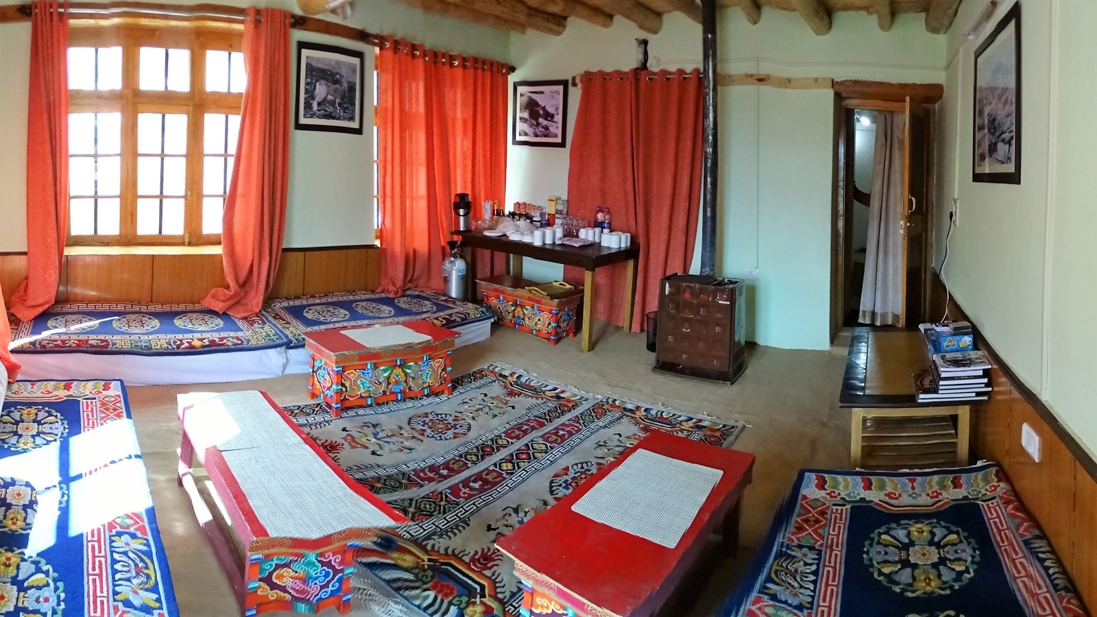 Accommodation is fairly basic, but comfortable and warm. Three twin bedrooms are en suite, while a further eight rooms share bathrooms. In winter there is no running water and hot water for washing is delivered in buckets. An assortment of Ladakhi, Indian and Continental cuisine is served in the communal dining room in the main house.