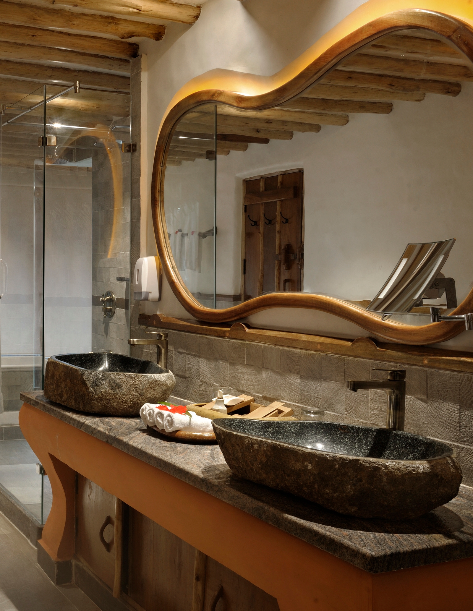 Although each room has minor design variations, all share the same elegant and comfortable features. The Safari Hut includes separate living and dining areas, an en-suite bedroom, and a private courtyard with a shallow water-jet pool, providing a perfect retreat for privacy. Drawing inspiration from the traditional Kuruba homes, the Pool Huts are ideal for peace and tranquility. The Pool Reserve features spacious living and dining areas, a private courtyard with a heated pool, and a unique Star Bed for stargazing under the clear Kabini night sky.