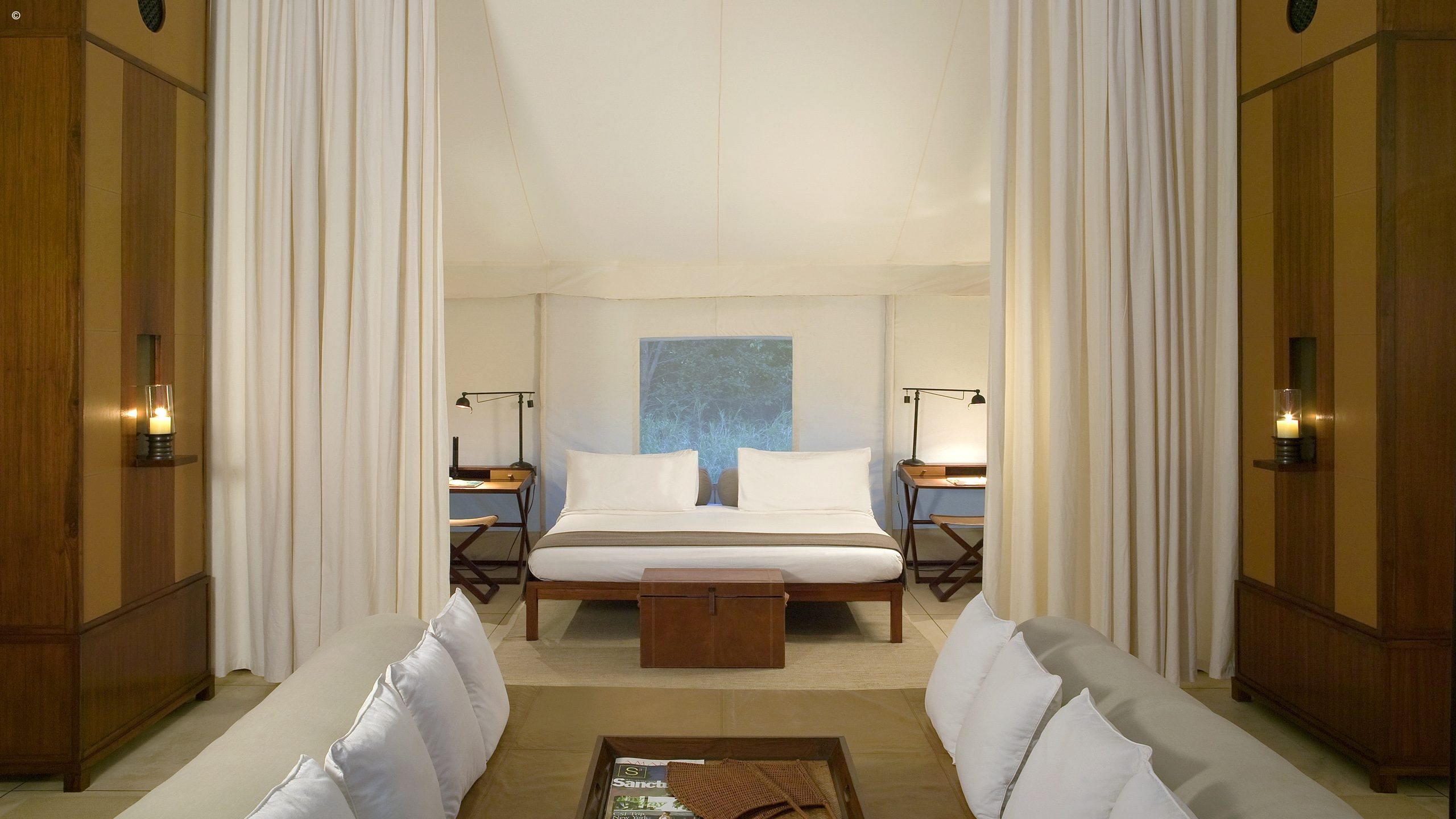 There are ten sumptuous tents spread out in the sun-dappled brushwood forest, each echoing Mughal pavilions with high canopied ceilings, huge beds and a sunken marble bathtub. White cotton curtains divide the sleeping, living and dressing areas with a sprawling daybed at the tent’s centre.