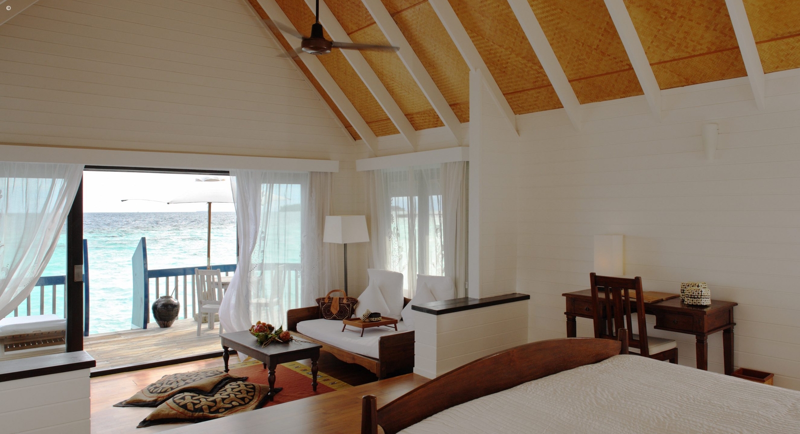 The suites on Makunufushi island resemble a collection of Kerelan boathouses, each with a private sundeck, vintage-style ceiling fans, whitewashed walls, and lavish en-suite with roll-top bathtub. The ultra-private one-bedroom villas also offer dining bales and outdoor showers.