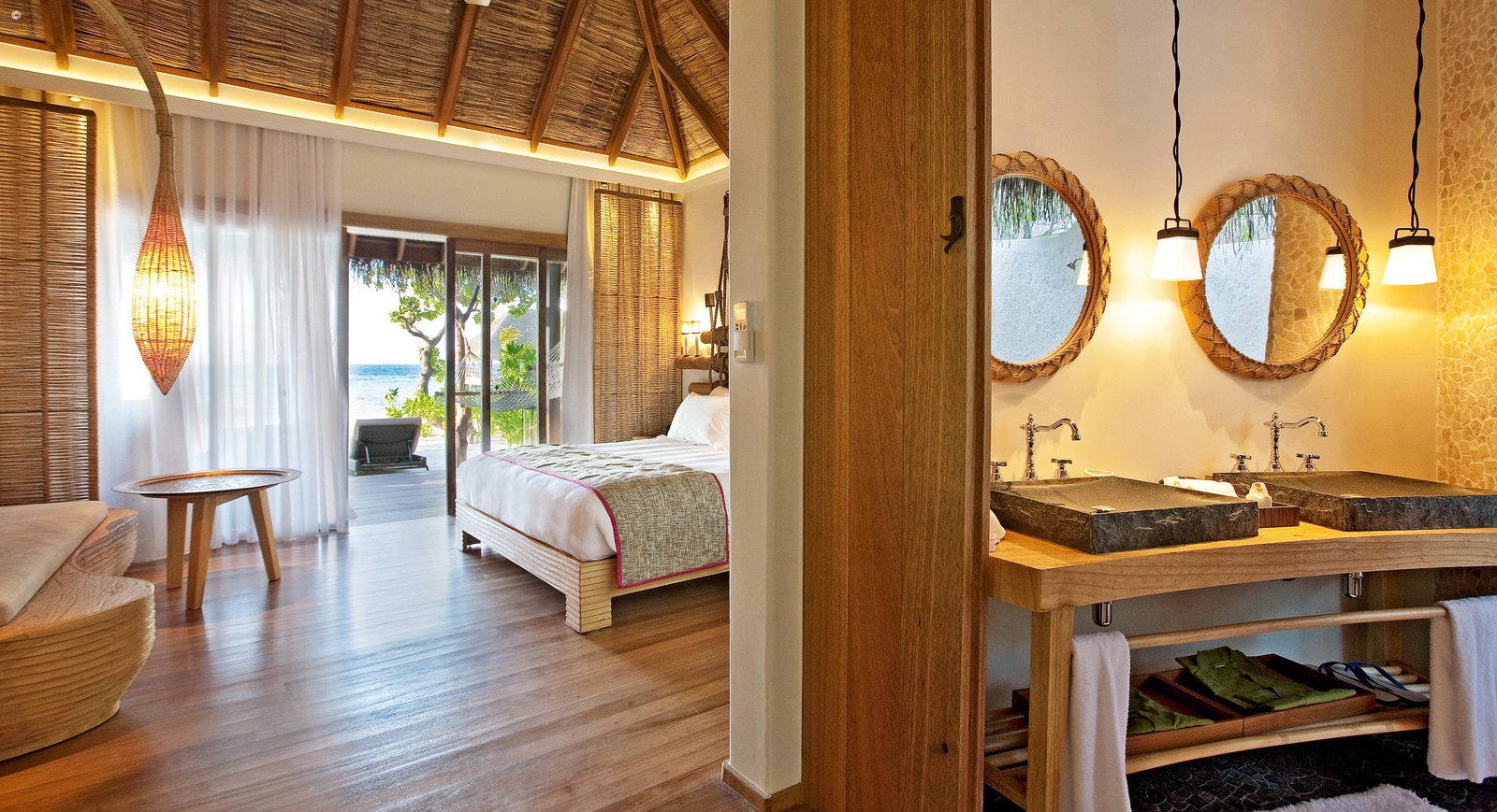 The wooden, bamboo and thatched roof bungalows unite a tranquil feel with modern-day amenities. The villas that sit on the wooden decking over the sea allow you to slip straight into the shallow lagoon for snorkelling. Beach villas are more simplistic with front terraces leading onto the sand.