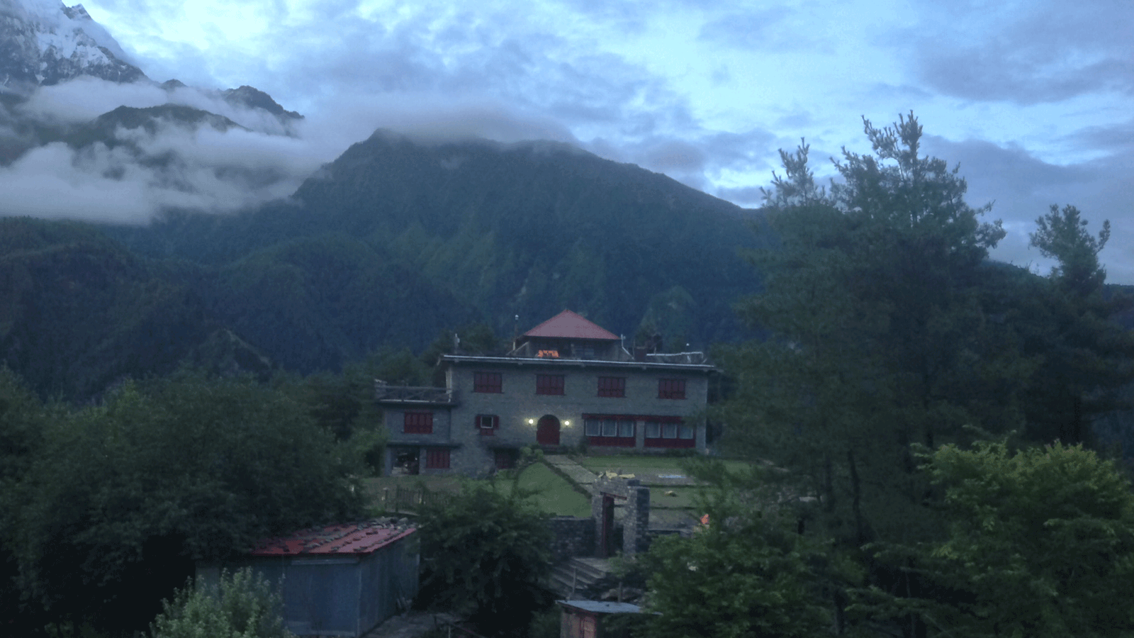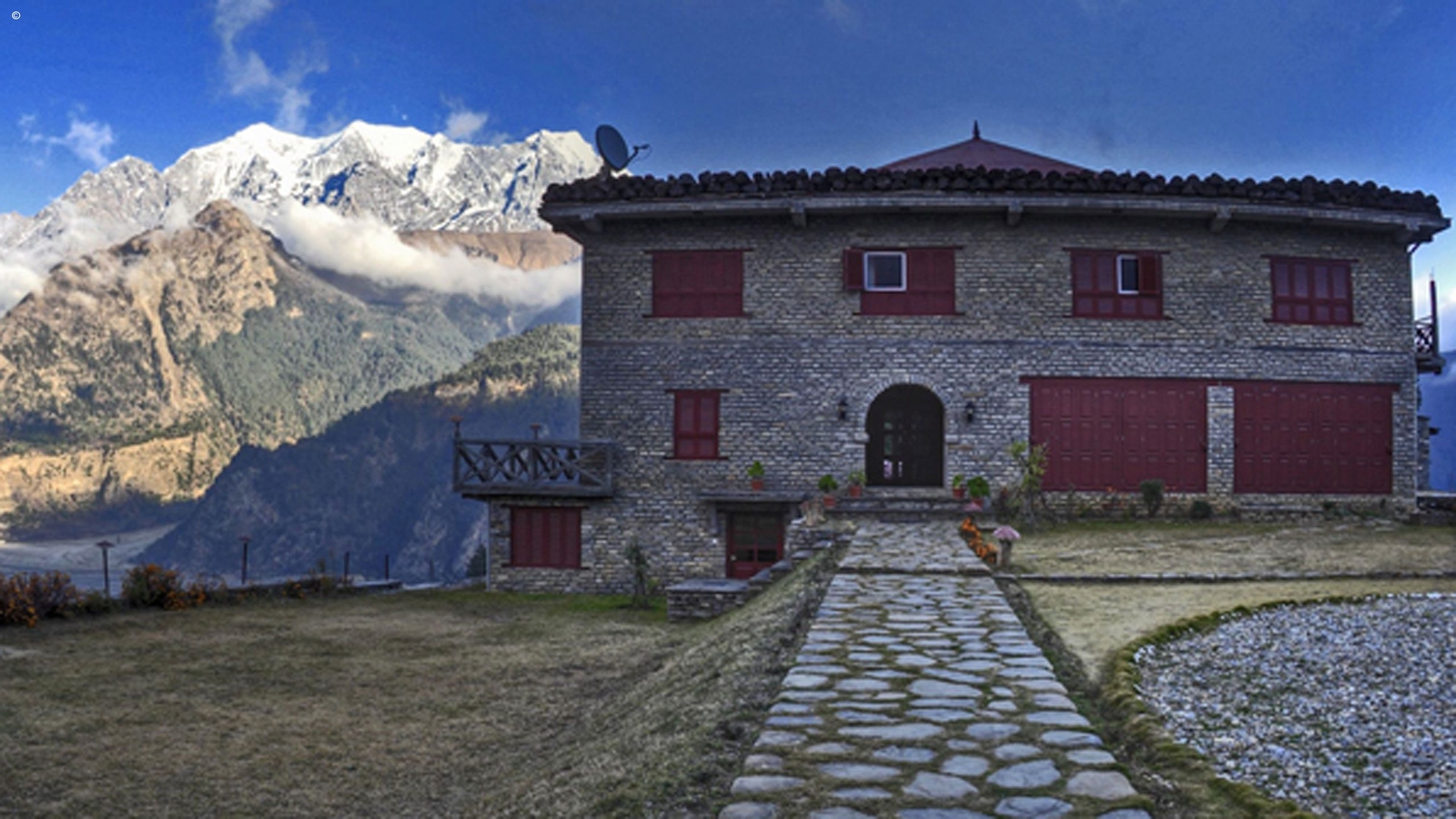 Remote trekking lodge surrounded by spectacular mountains