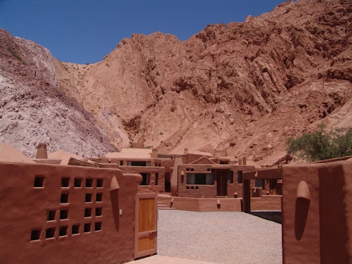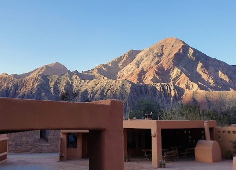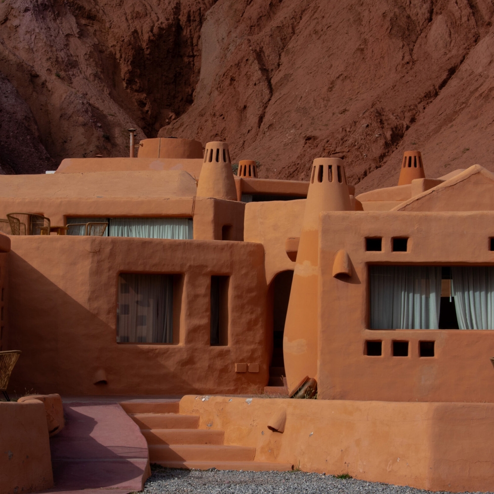 You’ll find the boutique cabin complex of Los Colorados in the picturesque town of Purmamarca, at the foot of the Cerro de Siete Colores. It is distinguished by an architectural style that is a fusion of Andean with contemporary details. The earthy exterior design and colours blend harmoniously with the surrounding hills and landscape. The structure’s rounded edges and reed roofs follow the irregularities of the palo santo beams.