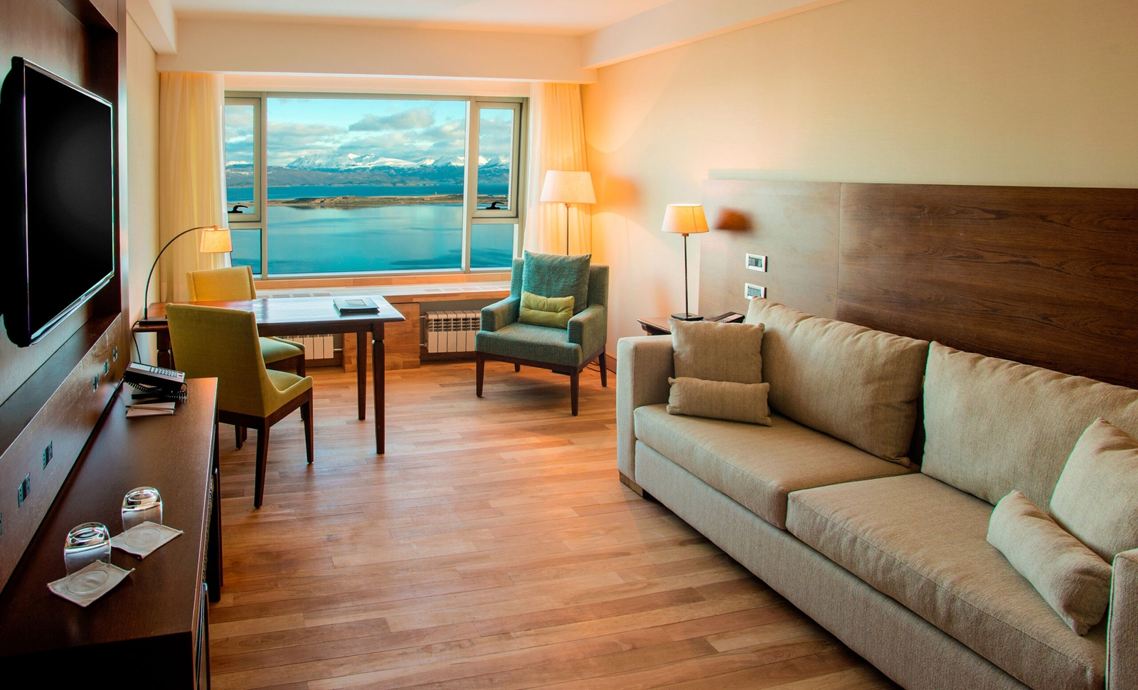 The five-star hotel, built according to sustainable architectural standards, offers fascinating views of the Beagle Channel. 117 modern rooms and fourteen luxurious suites enjoy large panoramic views: to the south, the Beagle Channel and Ushuaia city; to the north, valleys, mountains and the Natural Reserve. Look out for Mounts Cortes, Olivia, and Cinco Hermanos from parts of the hotel.