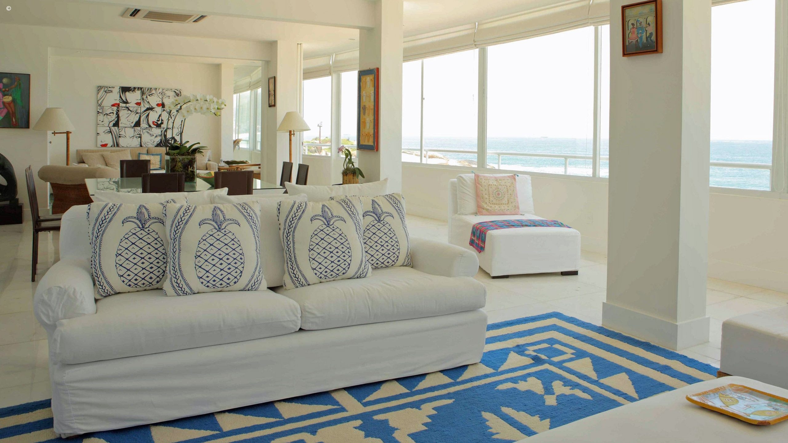 With views of Ipanema and Leblon beaches as well as the Dois Irmãos peaks, the apartment is stylishly decorated and reflects the colours pouring through its windows. With an appealing palette of cerulean blue and white the walls are adorned with modern art pictures and sculptures that reflect the owners eclectic and vibrant taste.