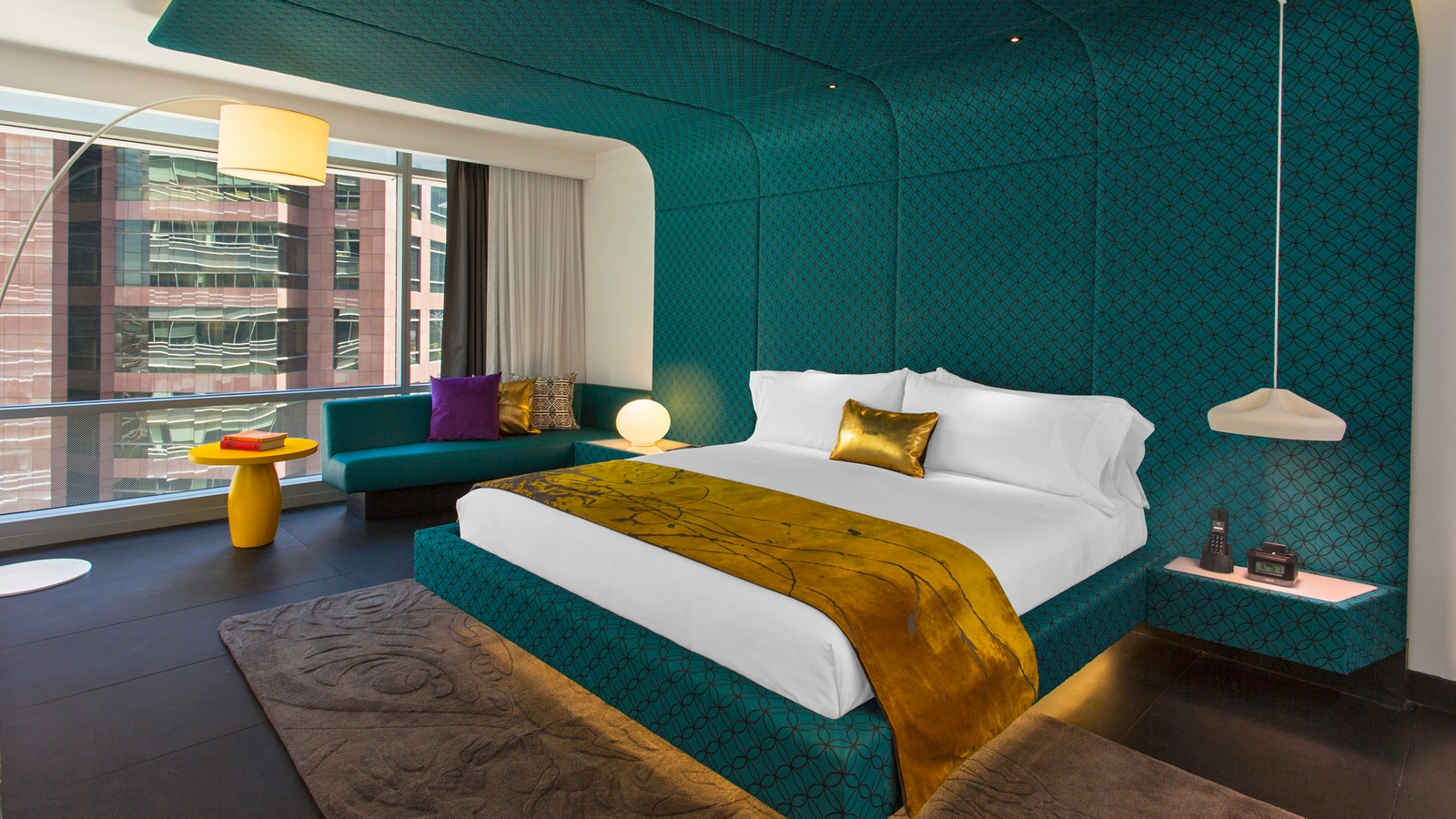 The W is inspired by the legend of El Dorado, a mythical chief who was covered in gold dust before setting sail on Lake Guatavita, into which his attendents threw gold and emeralds. There are several elements that allude to this magical tale throughout the hotel.