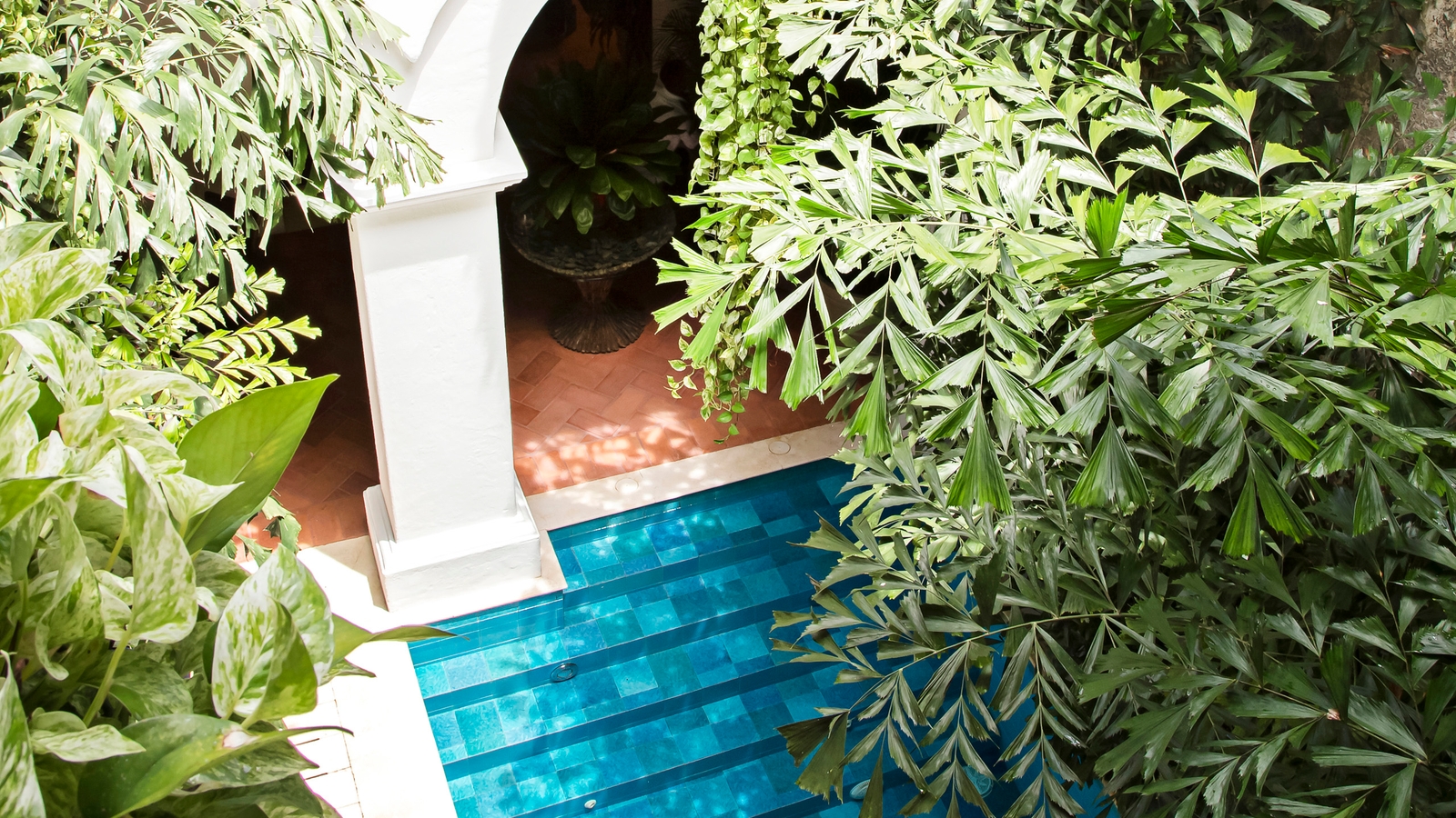This is a tall townhouse with six bedrooms spread over three floors. Greenery hangs down from the wraparound balcony, tumbling down to the ground floor where you’ll find a small shaded pool.