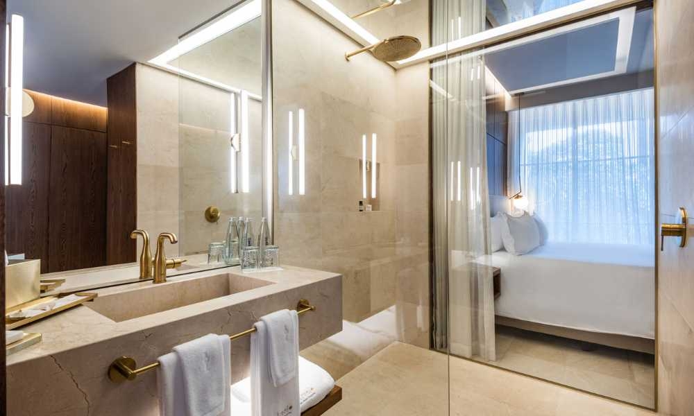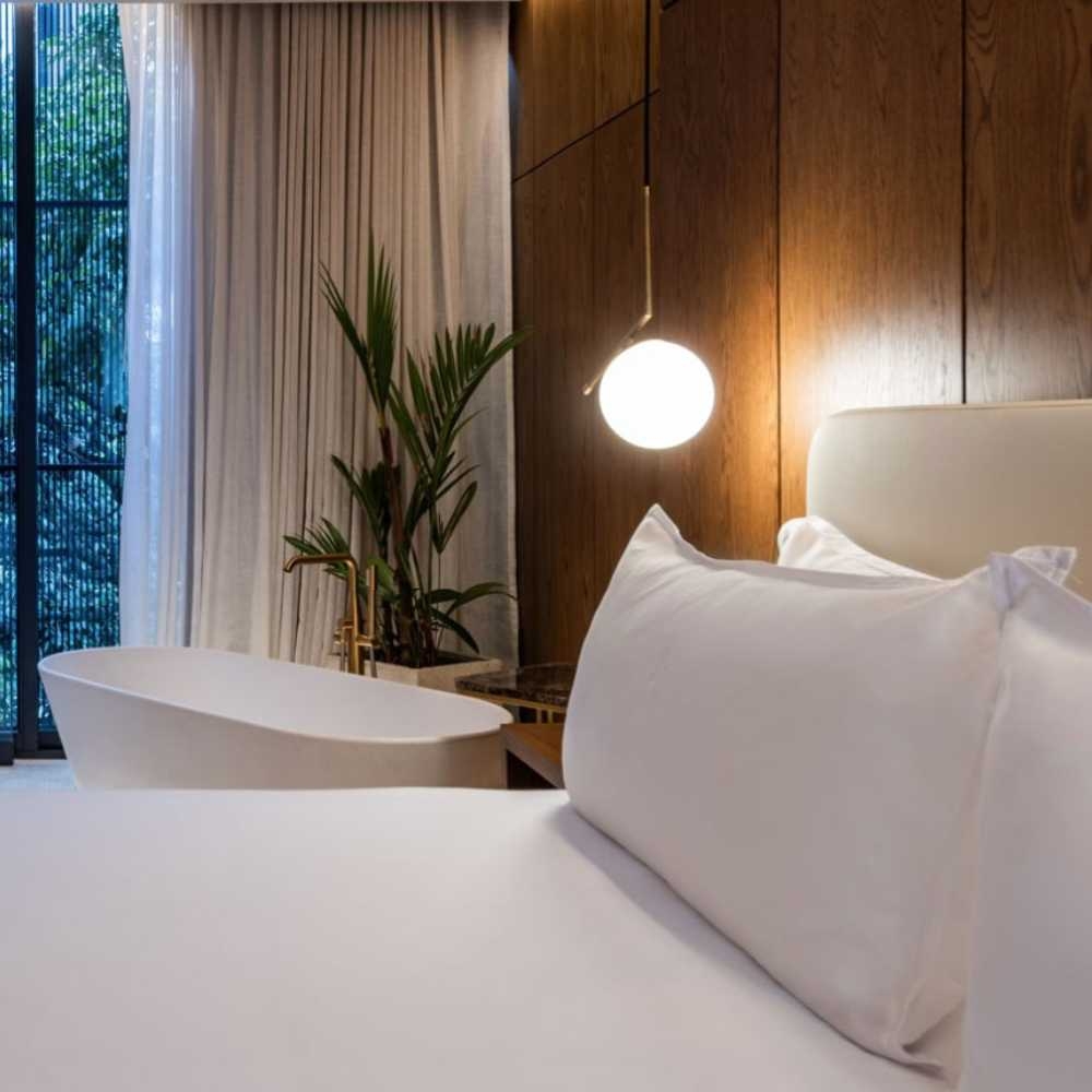 The hotel boasts four categories of guest suites ranging from the cosy, yet spacious standard suites to the larger presidential suites with living area, two bathrooms and luxury jacuzzi. The rooms are decorated within the same style as the hotel with chic wooden signature walls, marble floors and large windows draped with neutral toned luxury linen.