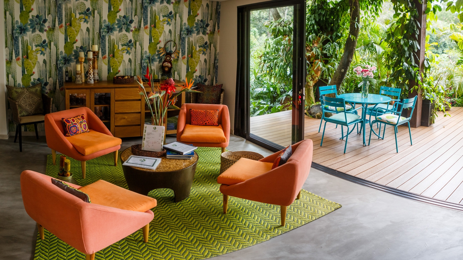 There is a small lounge and library decorated with handicrafts from across Colombia and a beautiful terrace where guests can enjoy breakfast. The lush gardens are filled with wild orchids and mango trees and a winding pathway lined with avocado and orange trees leads you down to a small decking area with a Jacuzzi.