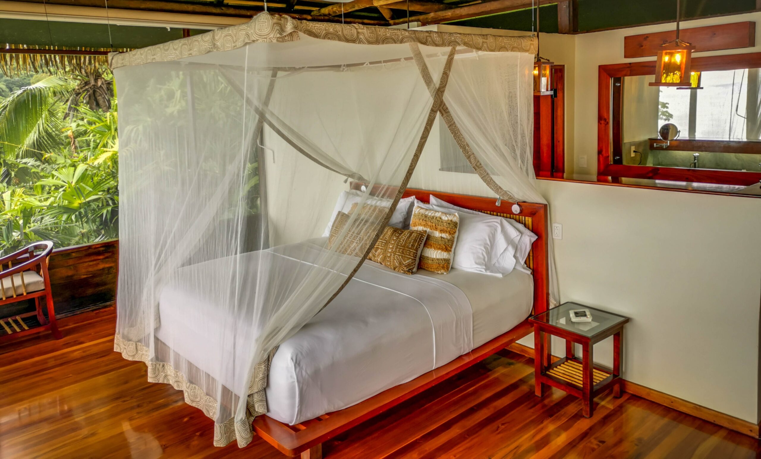 The hotel and each bungalow have sweeping views of the Pacific and rainforest canopies, and it’s a short downhill walk to a quiet and beautiful beach for a dip in the ocean.