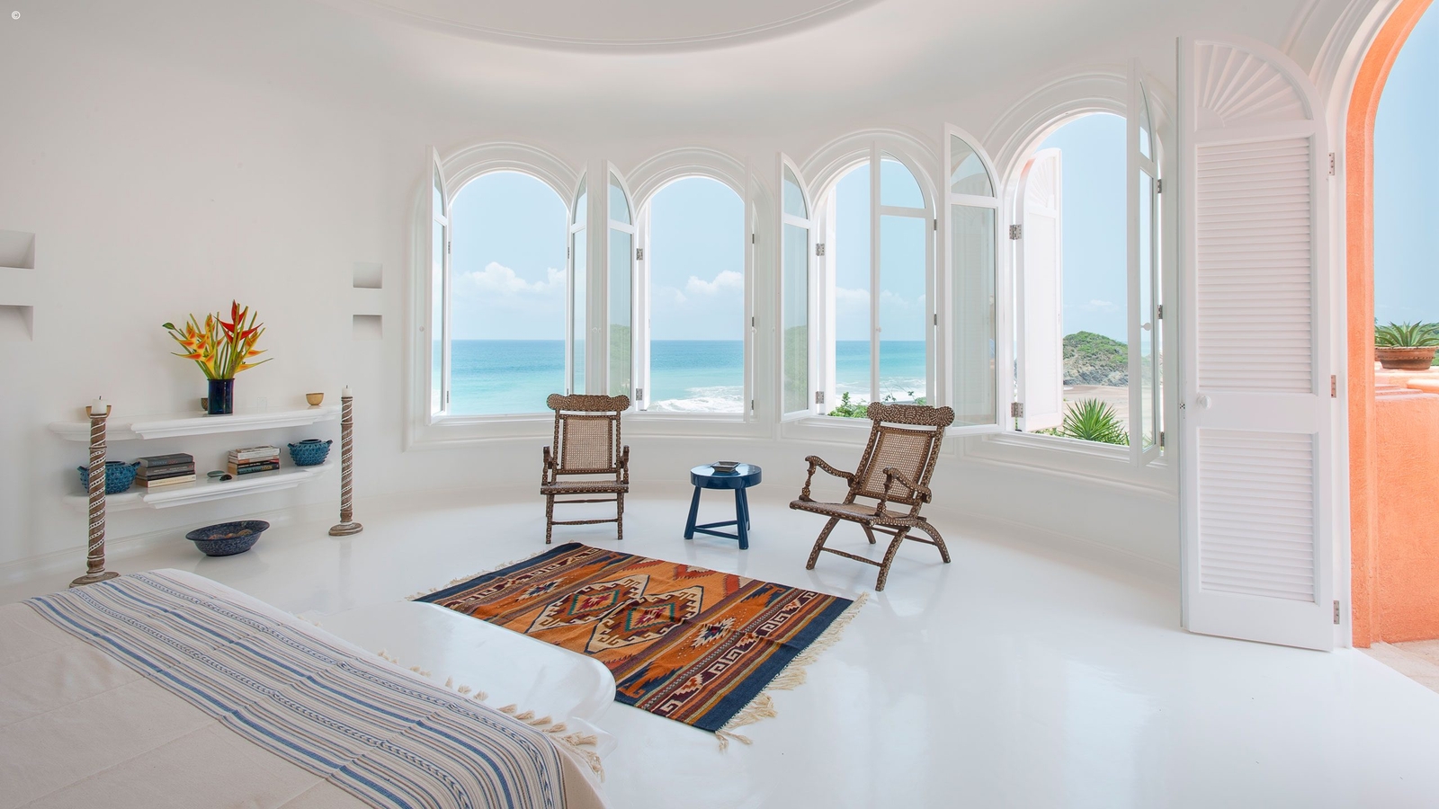 Described as a smaller version of the main Casa Cuixmala, the majestic La Playa is of a rare breed. Enjoy utter seclusion and impeccable facilities with a butler and cook service as well as access to all the amenities of the Cuixmala estate. La Playa has a stunning interior with serene white walls that elegantly contrast the colourful furnishings and big beautiful windows that allow light to pour in.