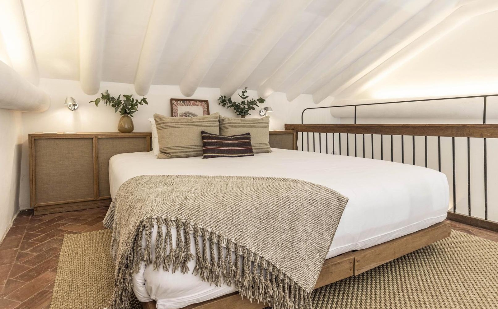 From a Balcony Suite, the largest of the collection, you can look across the peaceful Plaza Nazarenas. A carved door opens into its separate living area, whose staircase leads up to a bedroom raised on a mezzanine level.