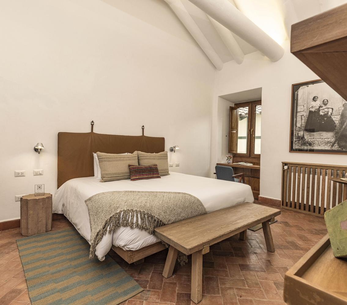 An intimate charm infuses the atmosphere here; there are only eight suites, each wonderfully spacious and distinct in its styling. You’ll notice typical Cusquenian details woven into their design, and across the hotel, including artisanal décor, preserved stonework and Inca ceramics. Adding to the sense of place are beamed ceilings, earthy palettes and original photographs by Peruvian photographer Martín Chambi.