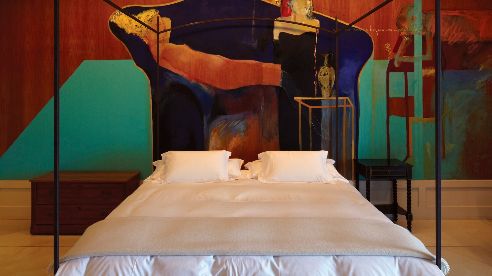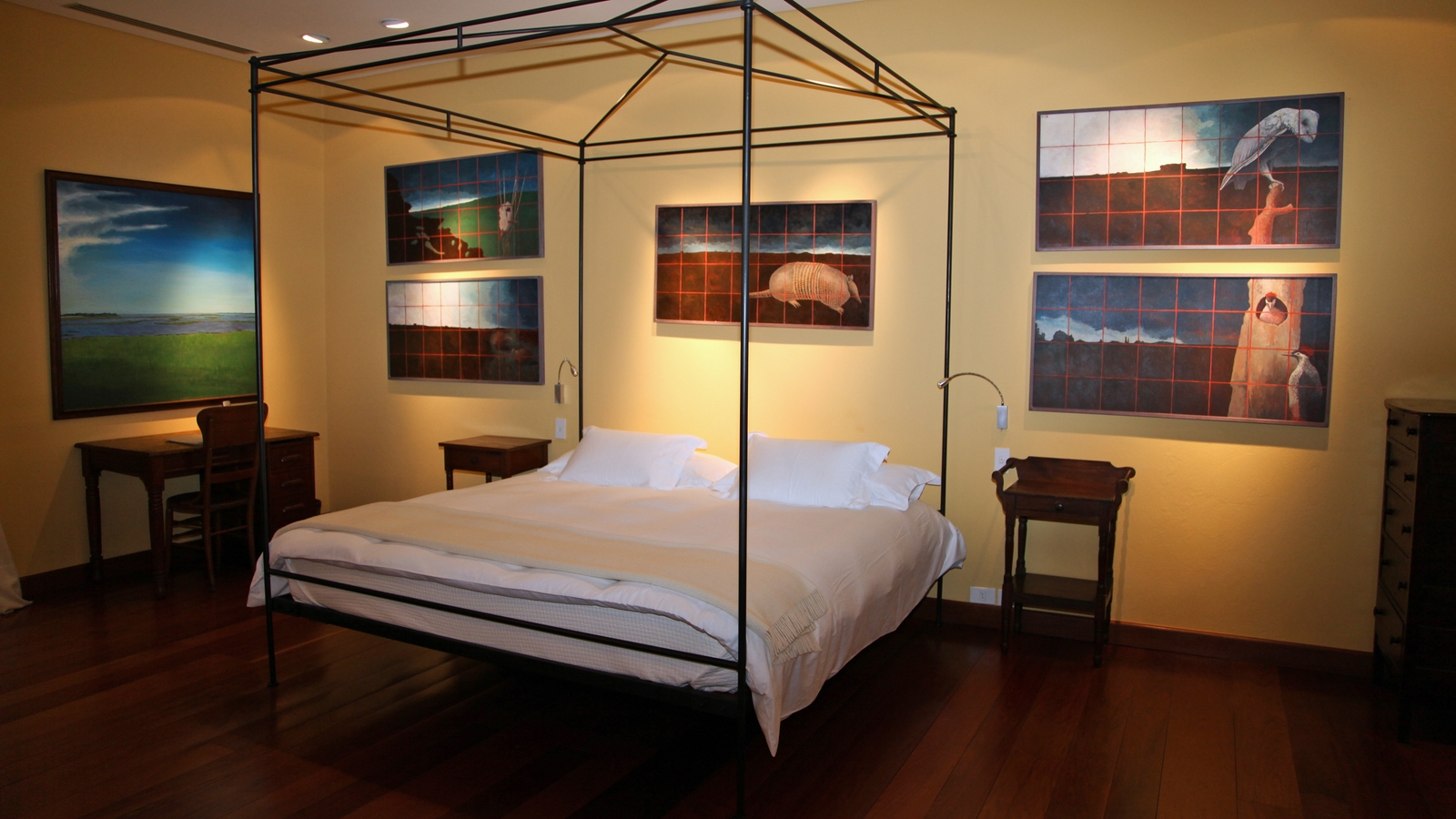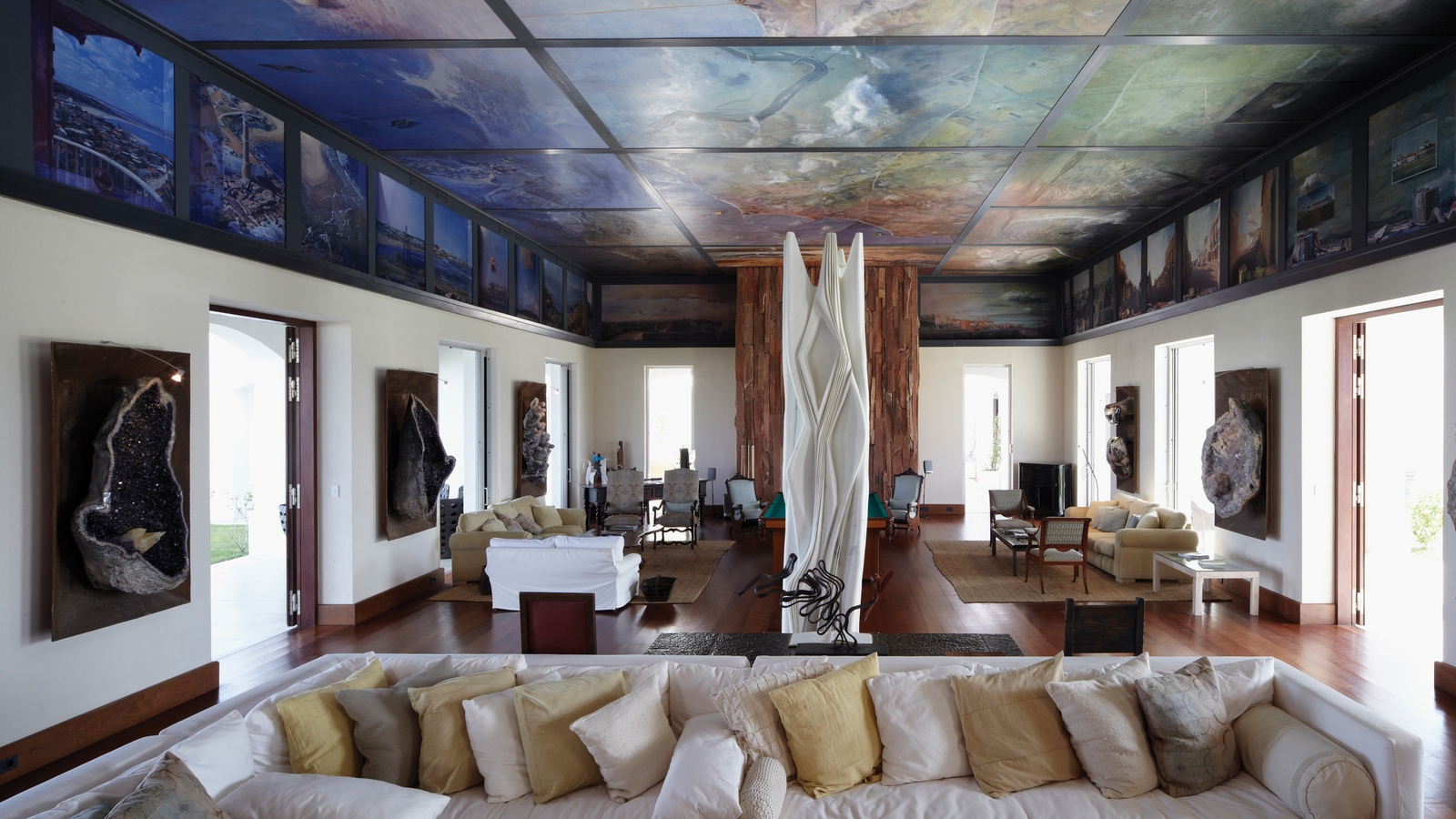 Every room seems to grab you and whilst you might not ever think to put this there or hang that there, you appreciate that this is very uniquely Uruguayan and the entire property is an unashamed dedication to its multi-faceted culture and style. The striking BBQ room is adorned with corrugated tin and slashed with paint and graffiti-like drawings. The main sitting room has a surrealist map of the country on the ceiling, huge rock gems mined from the north on its walls and a large marble sculpture by the celebrated sculptor Pablo Atchugarry right in the centre.