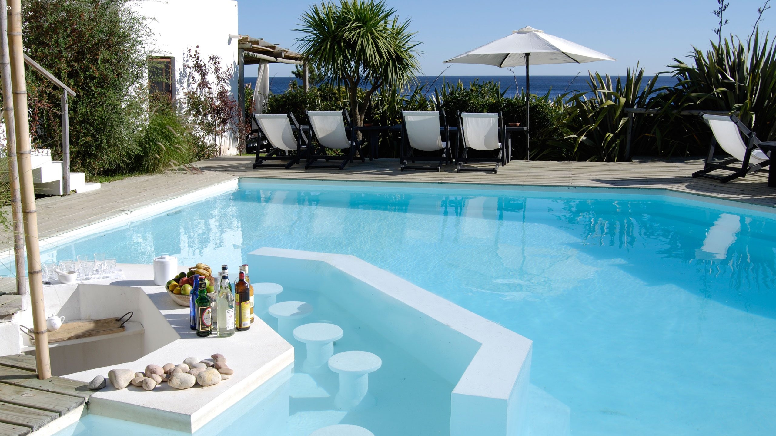 The clean modern lines and whitewashed walls give the hotel a modern Mediterranean feel with a lovely pool, decking and views down the coast.