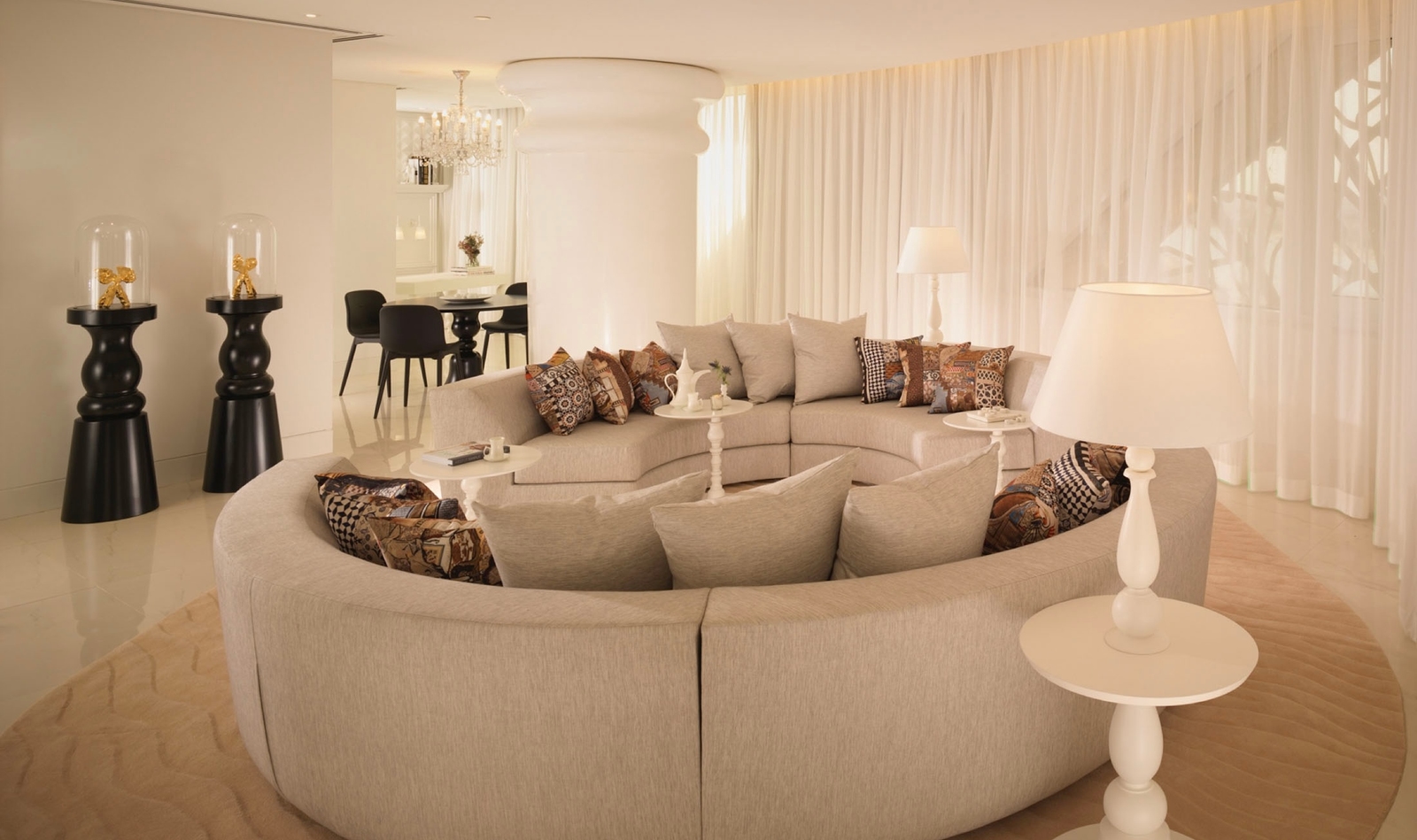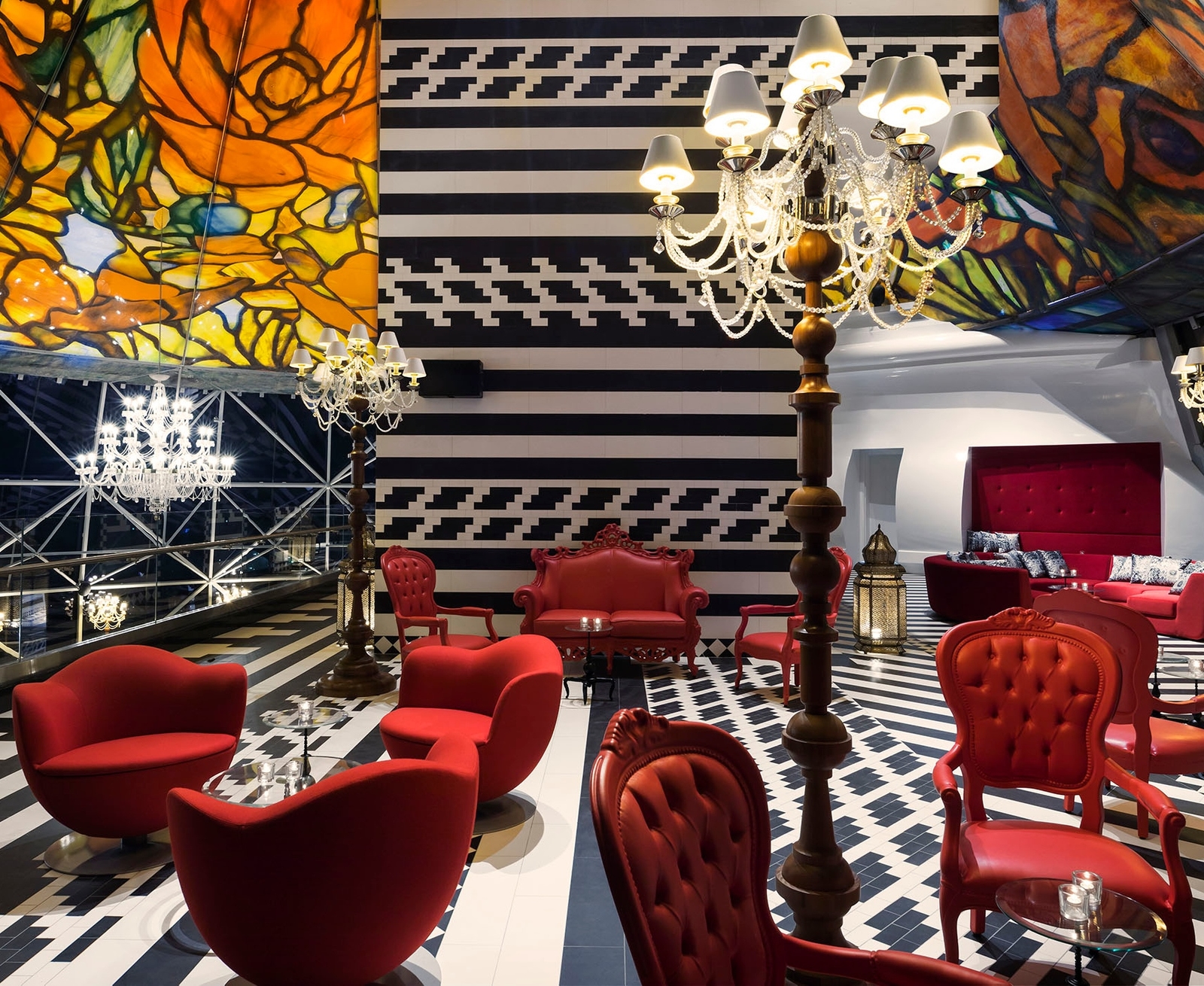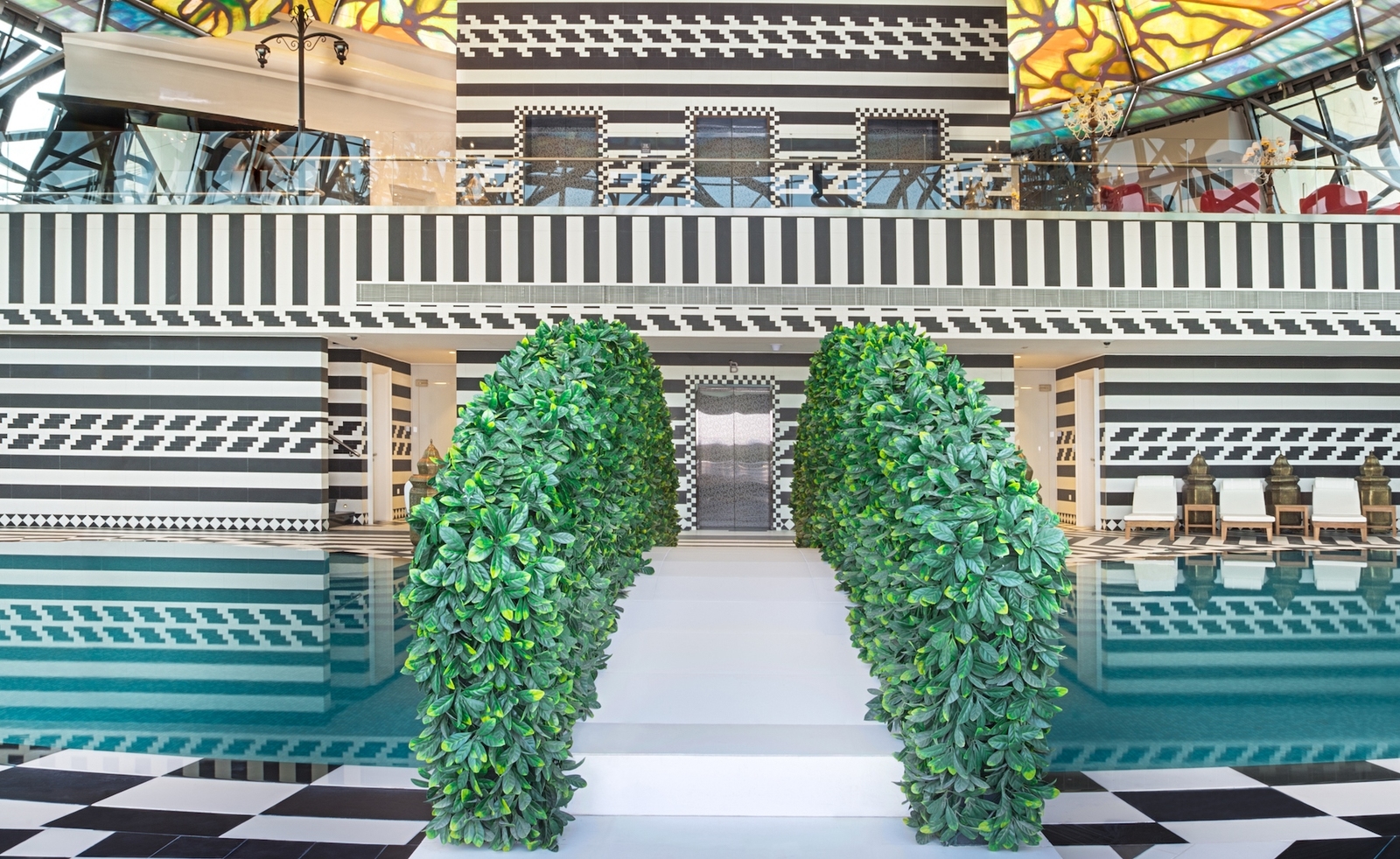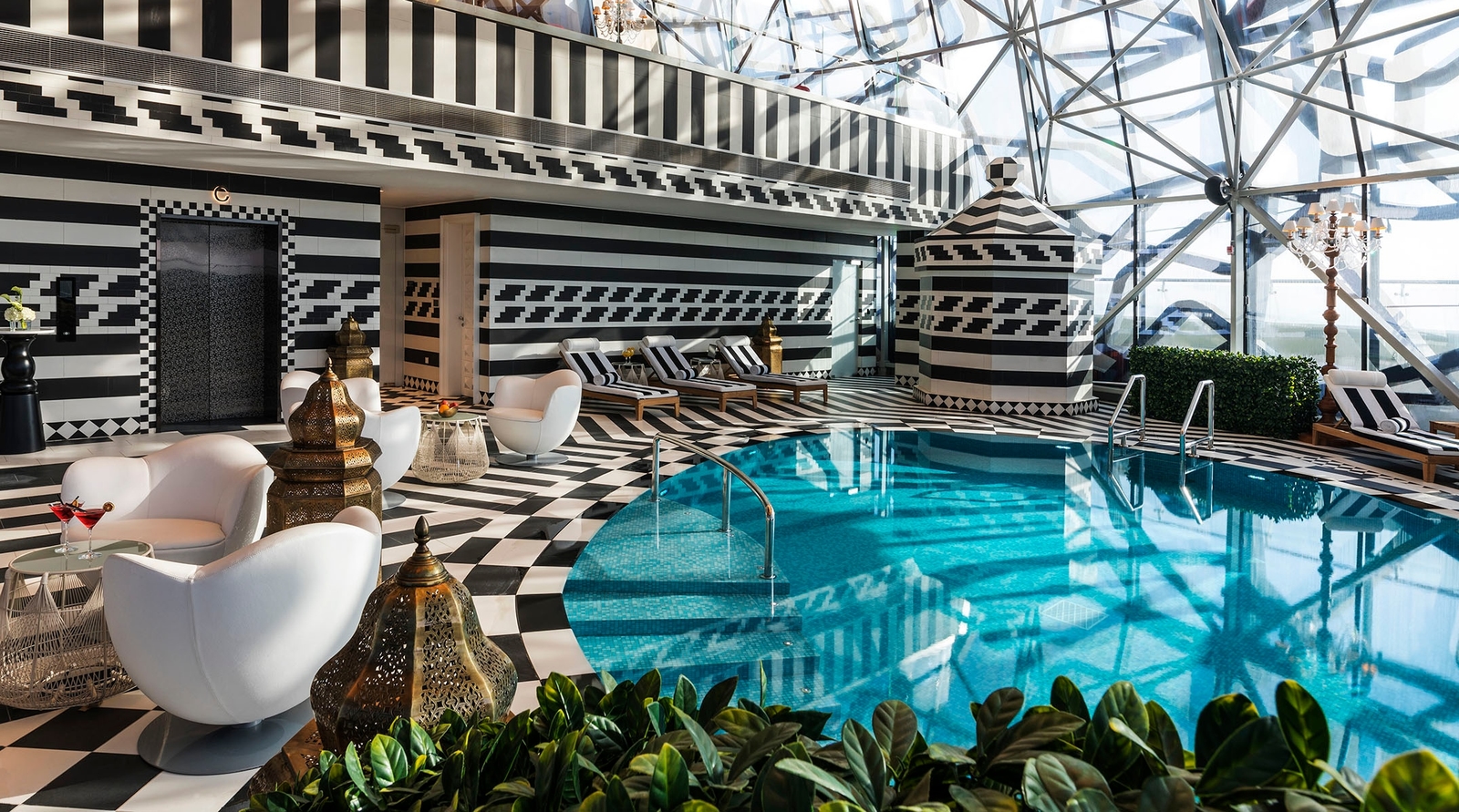 Sitting right above a mesmerising blue lagoon on the Qatar coast, Mondrian Doha is a vivid and flamboyant retreat in the country’s capital. On the outside, the building blends traditional Arabesque elements with swish modern architecture and arresting lighting, while its interiors are truly artworks of their own. The white atrium with its black twisted staircase is a dazzling sight, while the indoor pool is surrounded by arresting geometric patterns and a stained-glass ceiling.