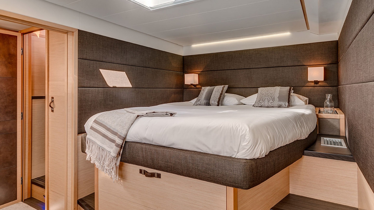 On board the roomy and comfortable catamaran you’ll find a full-equipped central galley. There’s also a spacious cockpit, an elevator platform, several sunbaths and two large trampolines at the front. On the flybridge there are helm stations, a solarium and a deck lounge with a bar.