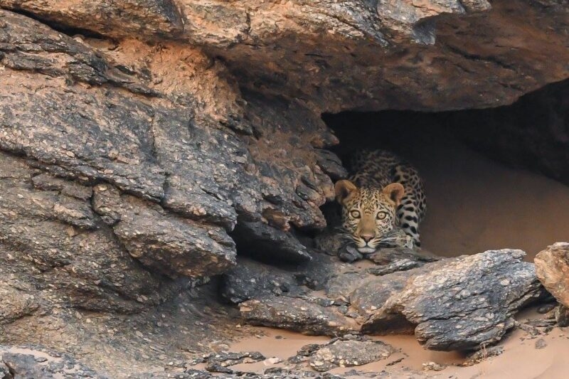 On their fourth day in Hoanib, Bob and Jacqueline couldn’t help but wonder if they were ever going to see any wildlife predators. As luck would have it, that same morning, they found a desert cheetah and her cub! Depicted in the photo on the left, this baby was throwing a tantrum, calling for his mother to follow him.”