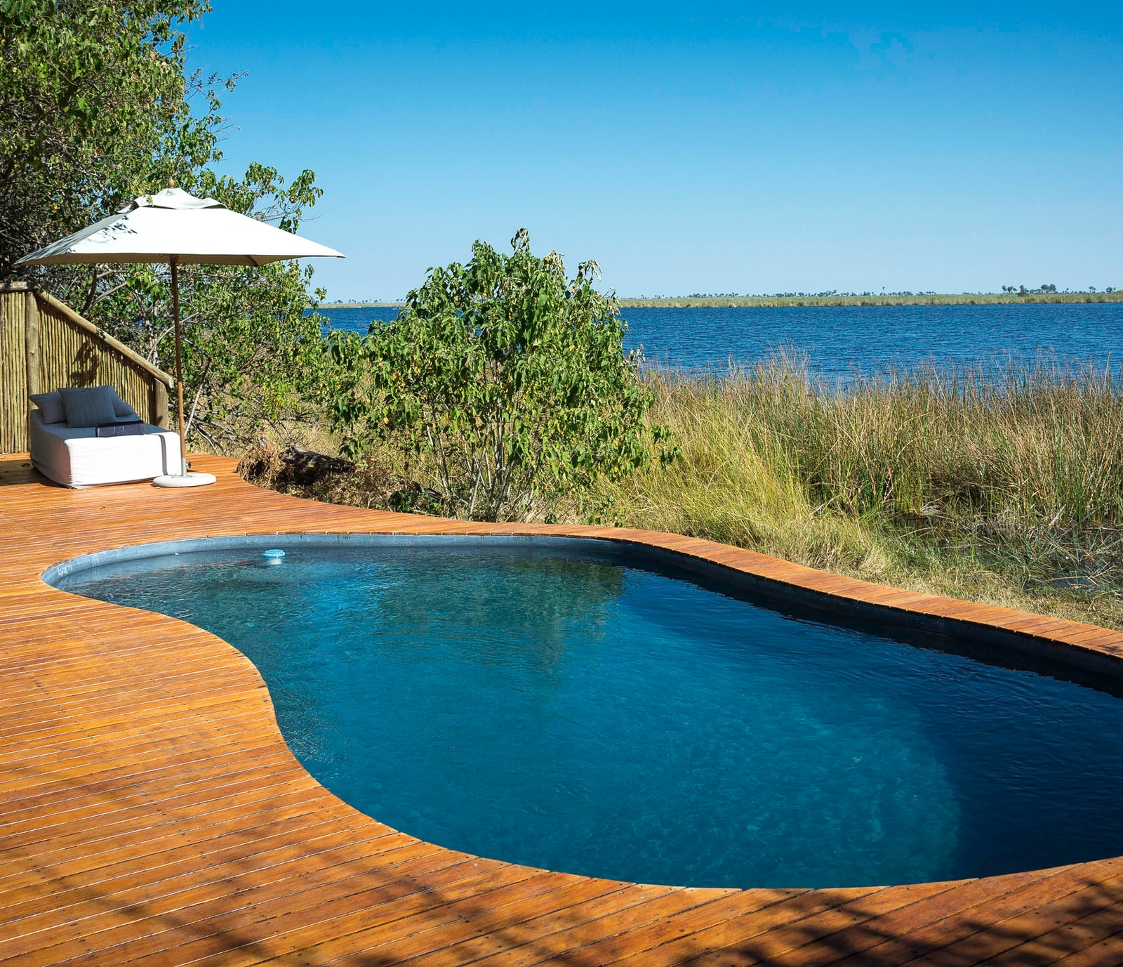 Inside, the camp celebrates its sense of place and culture, with design elements that pay homage to its wonderful setting with patterns, textures and colours bringing nature inside. Rooms at the lodge are amongst the biggest in the delta, all open plan, with a sunken seating area, private shaded deck and swimming pool outside as well as indoor and outdoor showers. There is an amazing sense of space here, in keeping with the wide-open plains that the rooms face onto. The rooms are open on three sides (with netting) giving a feeling of being closer to the nature and wildlife whilst still remaining is absolute comfort.