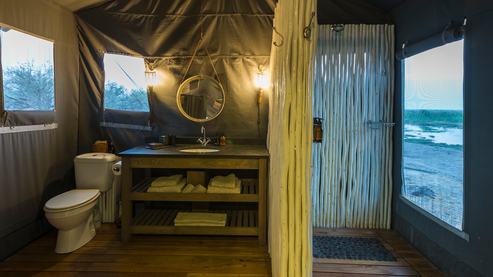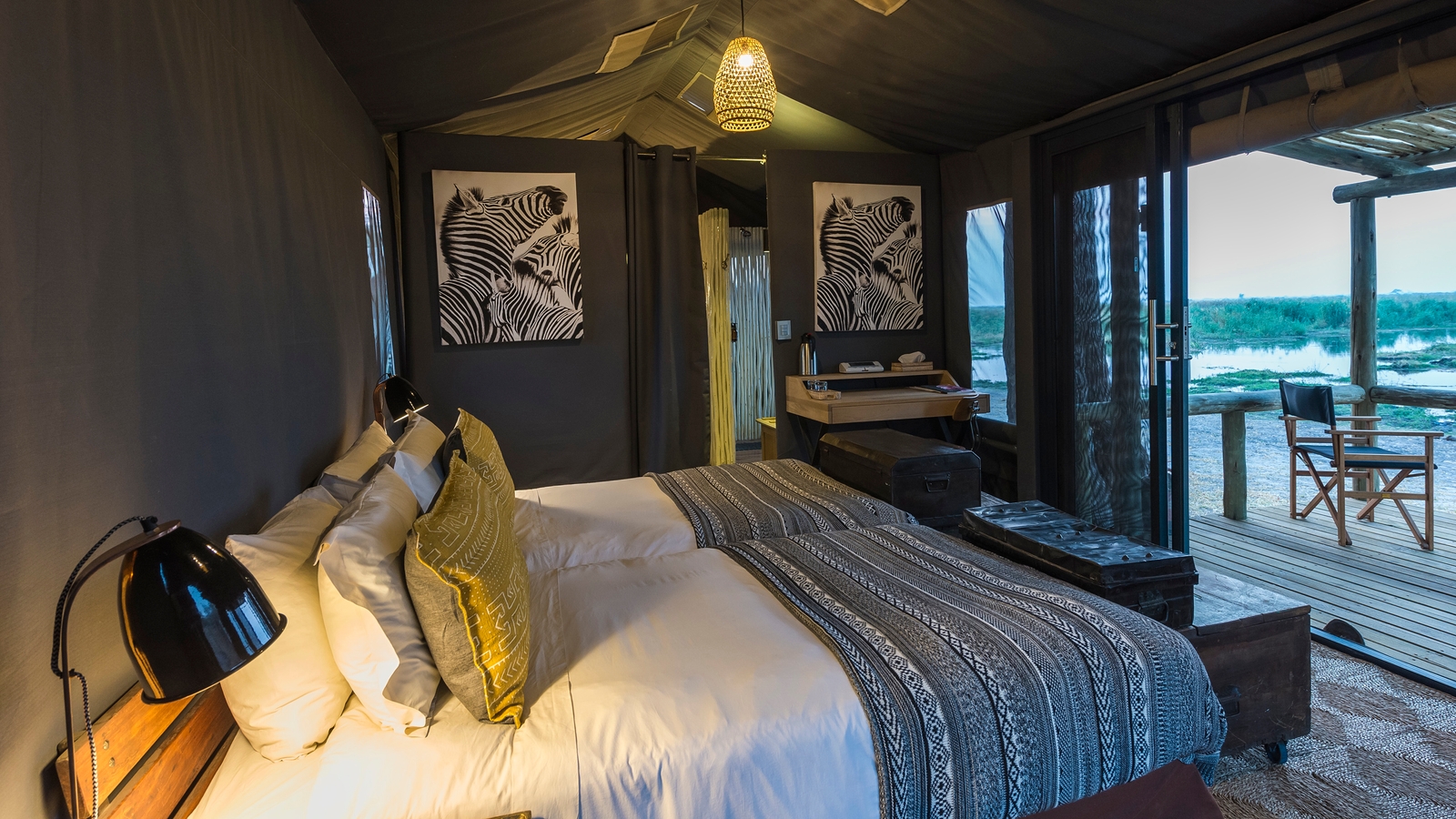 Selinda Explorers is an authentic tented camp drawing on traditions of the classic East African safari with beautifully detailed campaign style furniture made from recycled hard woods, and soft furnishings from Zanzibar and the East. Consisting of only four luxury guest tents, each with their own adjoining en-suite, private open air ‘bustani bathroom’ with explorer themed hot water bucket showers and flush porcelain toilets. Each tent overlooks the Selinda Spillway with a private verandah.