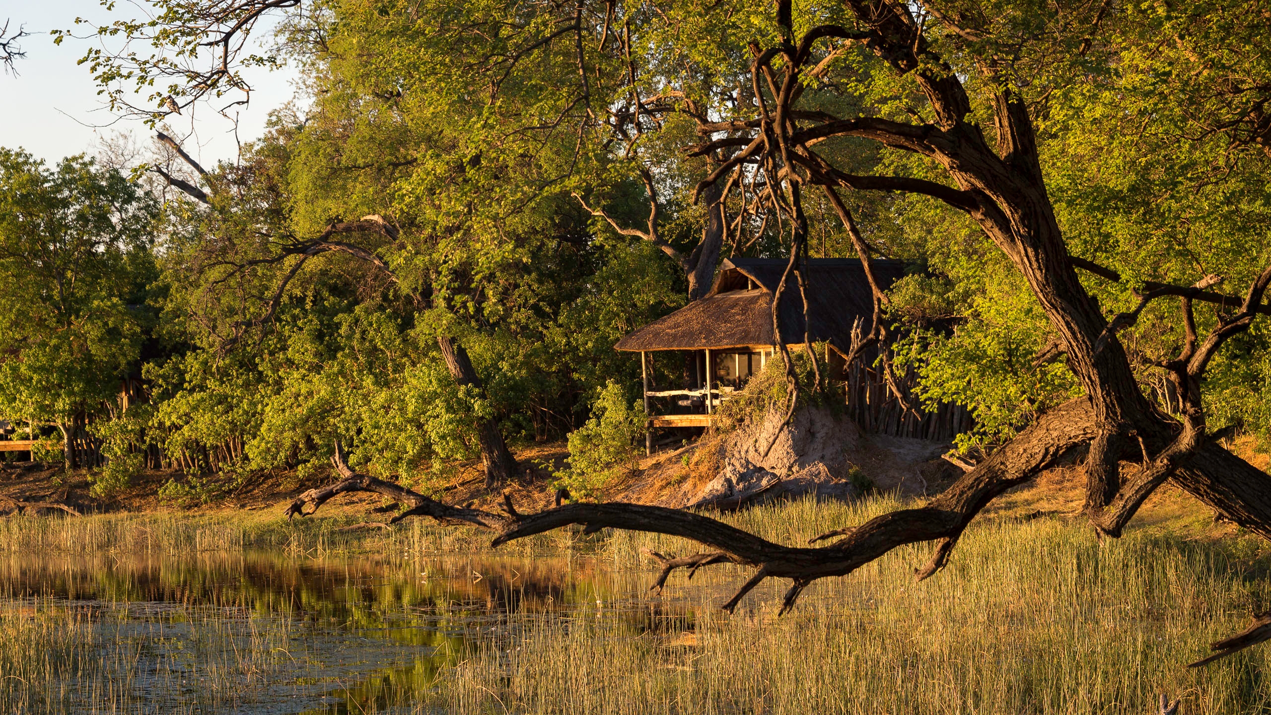 There are just seven large tents at this intimate camp, including a family unit that is raised off the ground. Outside the thatched dining area, a small pool and large viewing area with fire pit extend outwards on raised wooden decks, providing a wonderful view over the channel and its prolific wildlife.