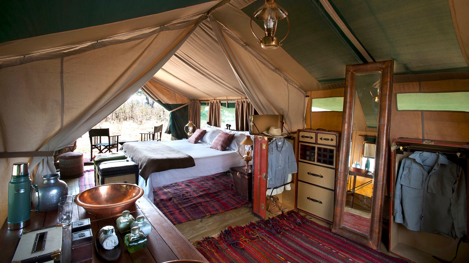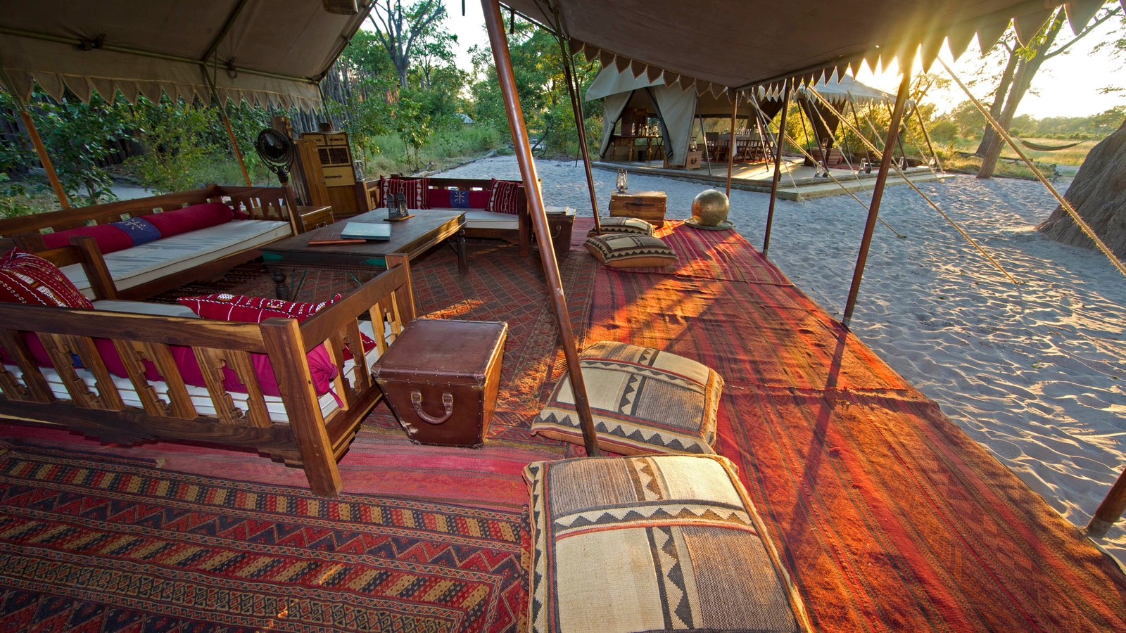 Selinda Explorers is an authentic tented camp drawing on traditions of the classic East African safari with beautifully detailed campaign style furniture made from recycled hard woods, and soft furnishings from Zanzibar and the East. Consisting of only four luxury guest tents, each with their own adjoining en-suite, private open air ‘bustani bathroom’ with explorer themed hot water bucket showers and flush porcelain toilets. Each tent overlooks the Selinda Spillway with a private verandah.