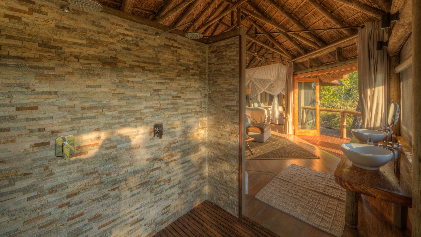 In between game drives, guests can relax around the sunken bar, built around a large termite mound and ebony tree, or in the expansive lounge area which leads towards a library and the decking. These areas, as well as the elevated dining area, are connected by boardwalk to the fireplace in front of the camp. The camp also features an open air boma and swimming pool.