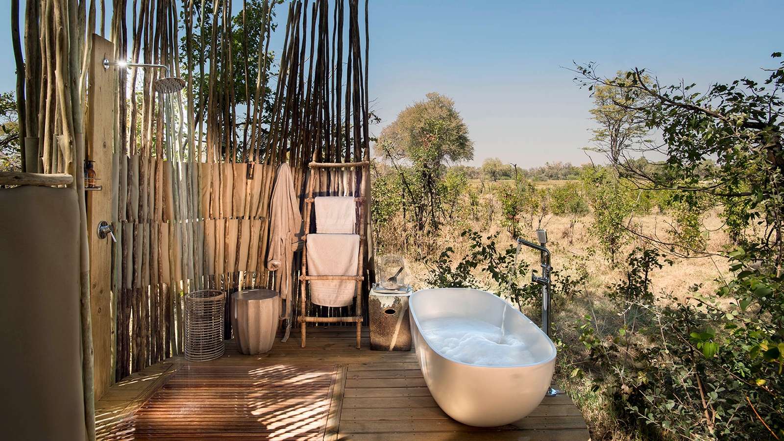 The camp itself has 12 luxury safari tents elevated on decks to give you a view of the lagoon, each with en suite bathrooms, indoor and outdoor showers and a veranda. You can watch passing herds of plains game, elephant and buffalo coming to drink from the camp’s swimming pool, lounge and bar.
