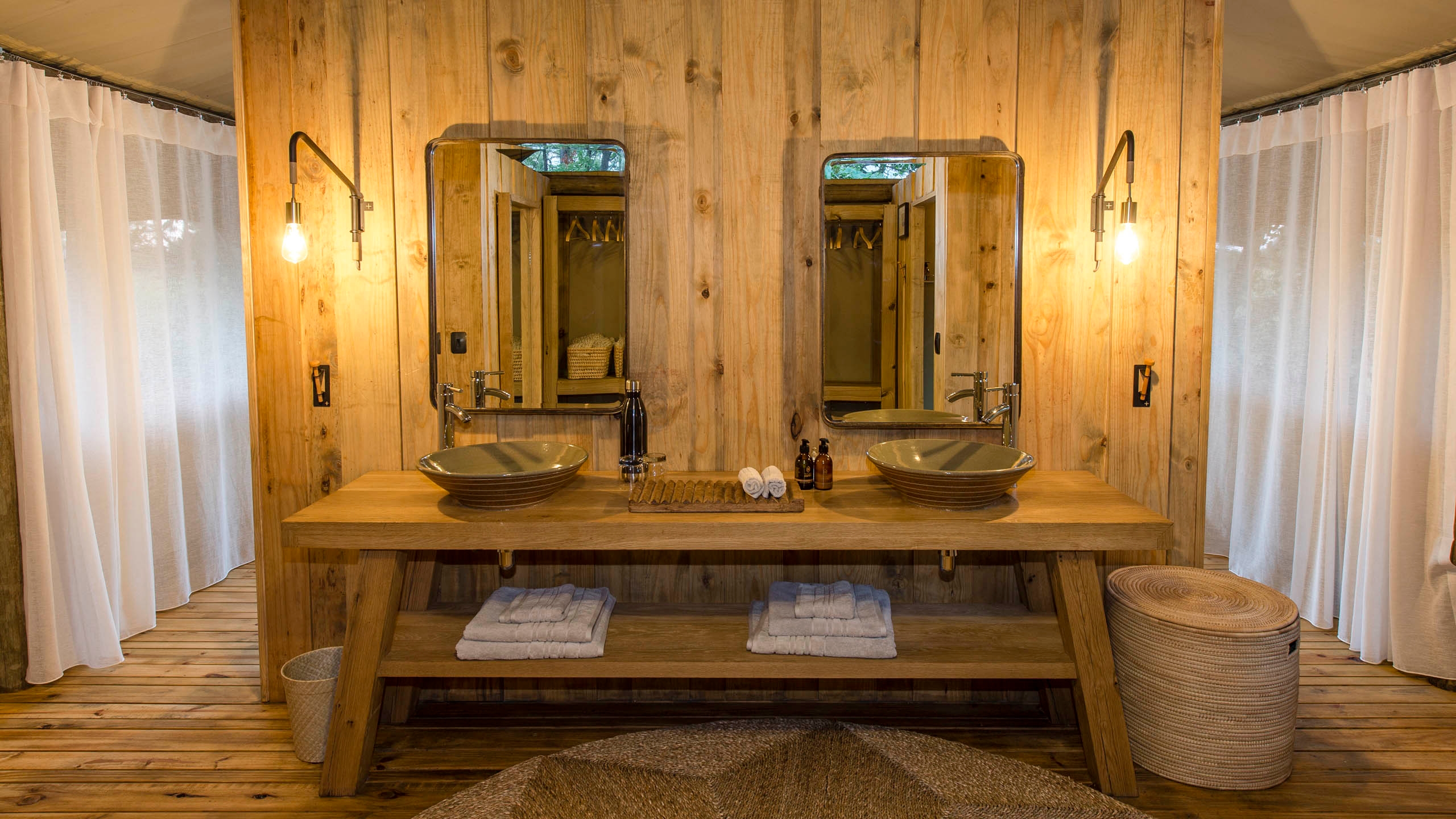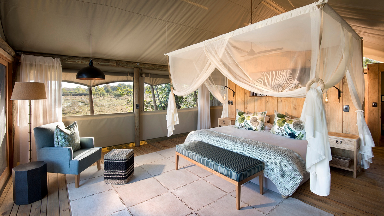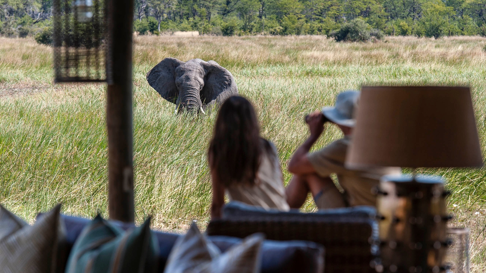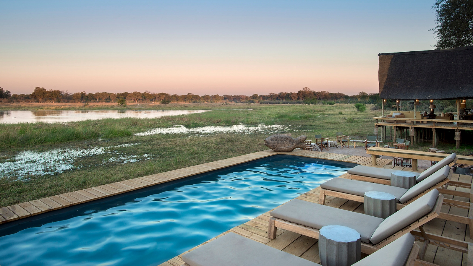 The camp itself has 12 luxury safari tents elevated on decks to give you a view of the lagoon, each with en suite bathrooms, indoor and outdoor showers and a veranda. You can watch passing herds of plains game, elephant and buffalo coming to drink from the camp’s swimming pool, lounge and bar.