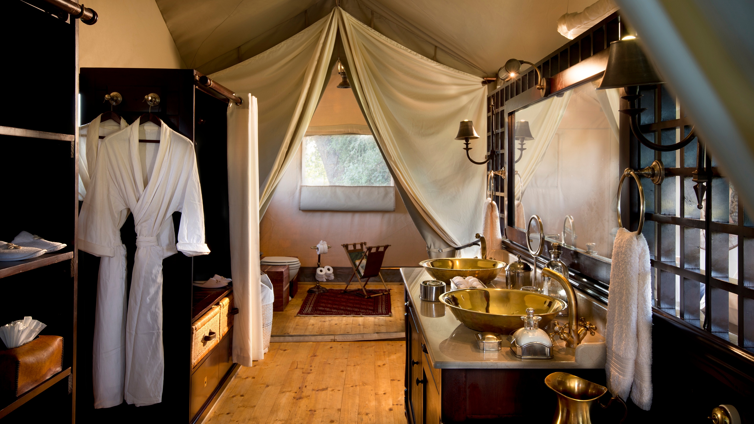 The camp is built on a wooded island and consists of six expedition-style tents that sit on slightly raised decking and look out across the surrounding floodplains. With wooden writing desks and large four-poster beds, the tents are designed to evoke feelings of old-school safari xploration. There are en-suite bathroom and an open-plan living and dining area, which opens on all sides, leads out onto a private verandah.