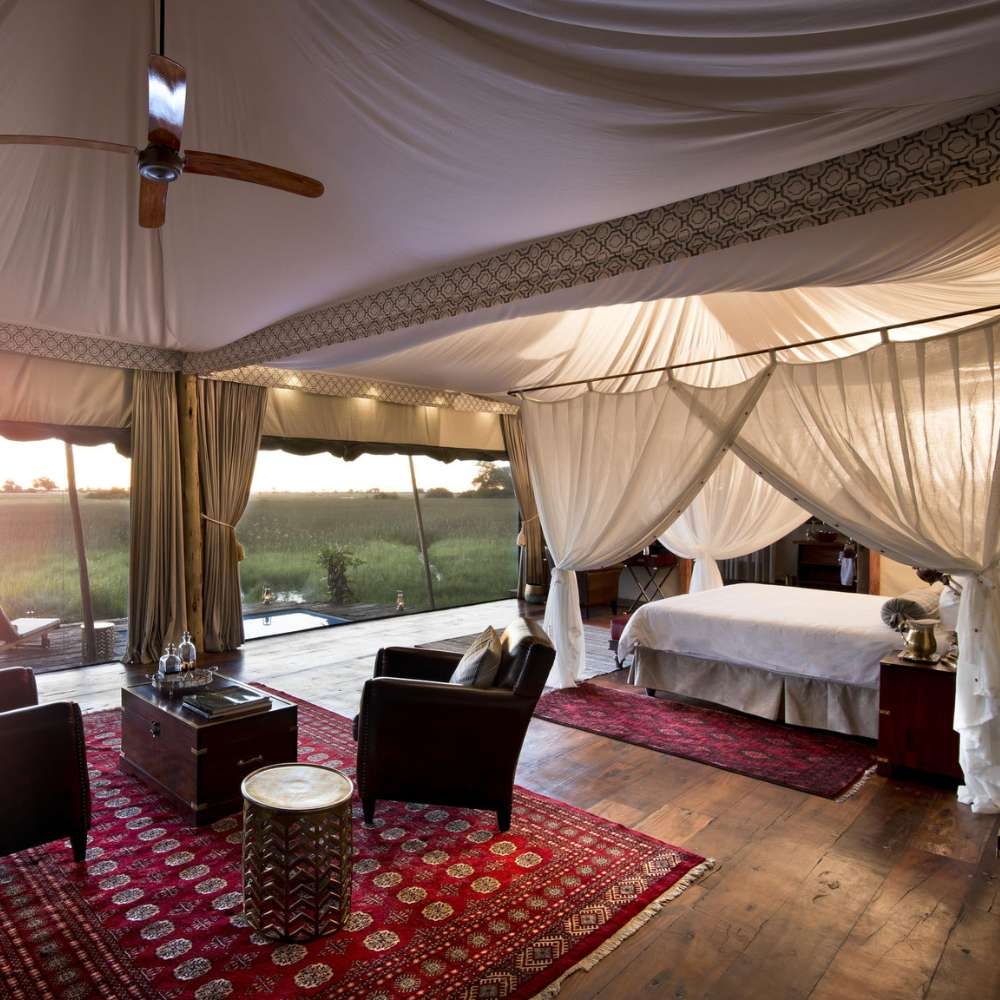 Simply one of the most beautiful tented camps in Africa, Zarafa is a triumph of conservation and attention to detail. There are just 4 immense tented suites set on raised wooden platforms overlooking the floodplain of the Zibadianja Lagoon. The tents are decorated in a style befitting of the explorations of the early 20th Century, matched with modern comforts and technological surprises. Outdoor decking wraps around each guest suite and offers guests a private plunge pool, private outdoor shower, and outdoor seating.