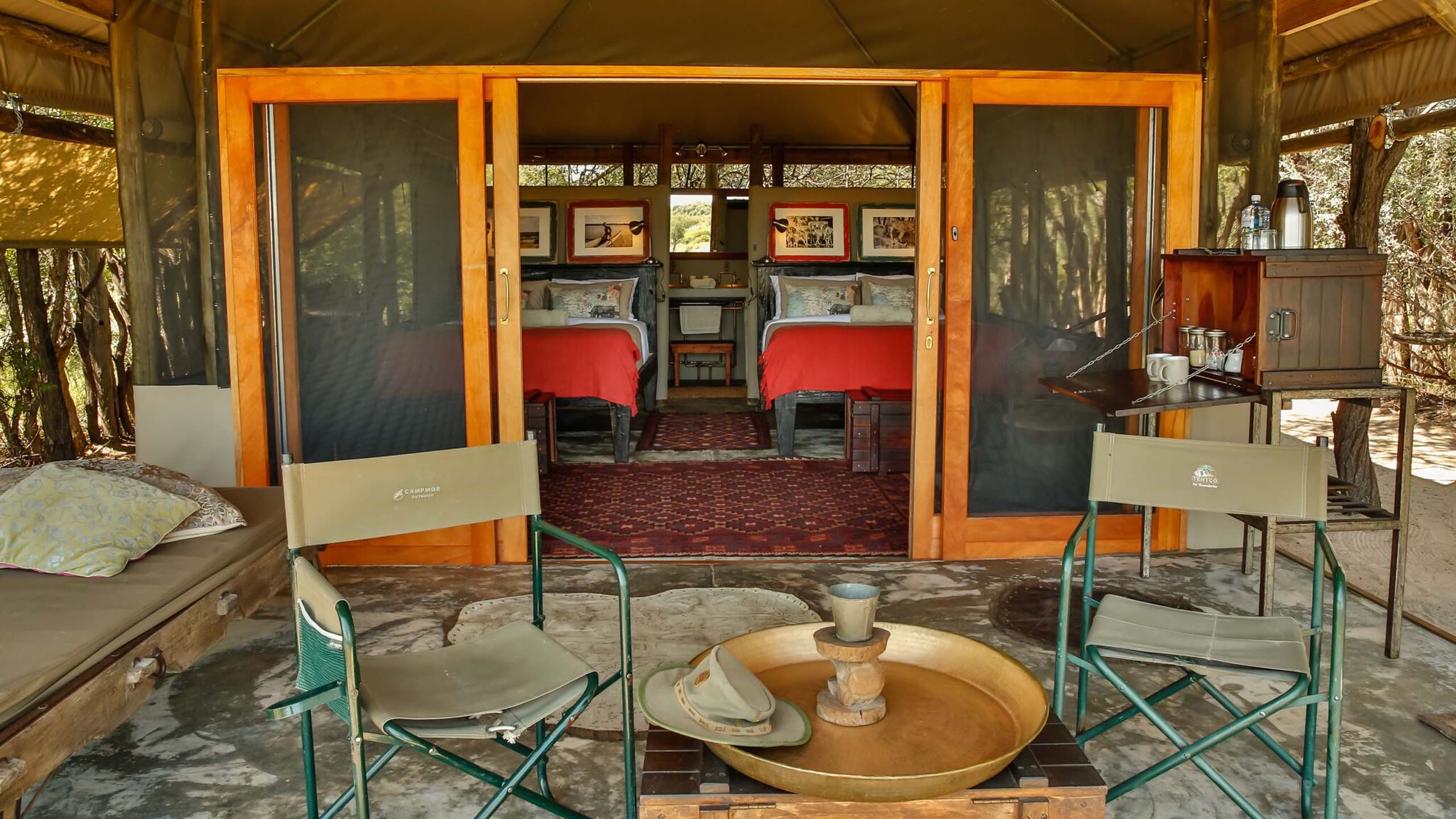 Meno a Kwena boasts nine classical and comfortable canvas tents, all with en suite bathrooms, with verandahs overlooking the river which draws elephant and zebra from far around with some of the best game viewing right in front of the camp itself.