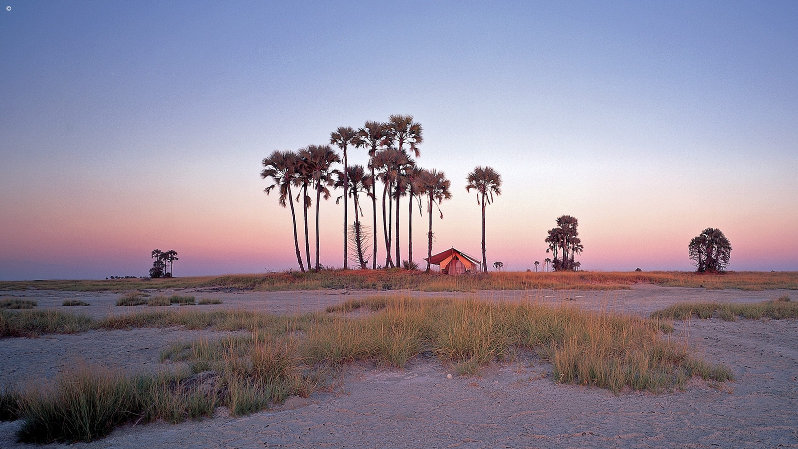The camp itself mirrors the simplicity and open spaces of the pans. Six elegant spacious pavilion style tents sit each under a cluster of tall palms. Period style pieces adorn the interiors with lovely wooden chests, boxes and brass fittings about. Bathrooms are equipped with bucket showers and a flush toilet. The rooms are lit by the warm glow of old-fashioned spirit lamps.