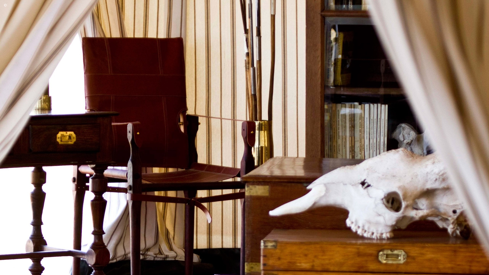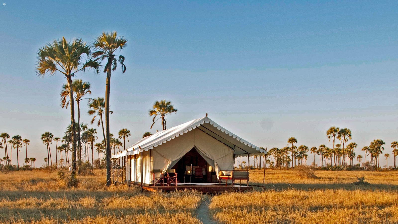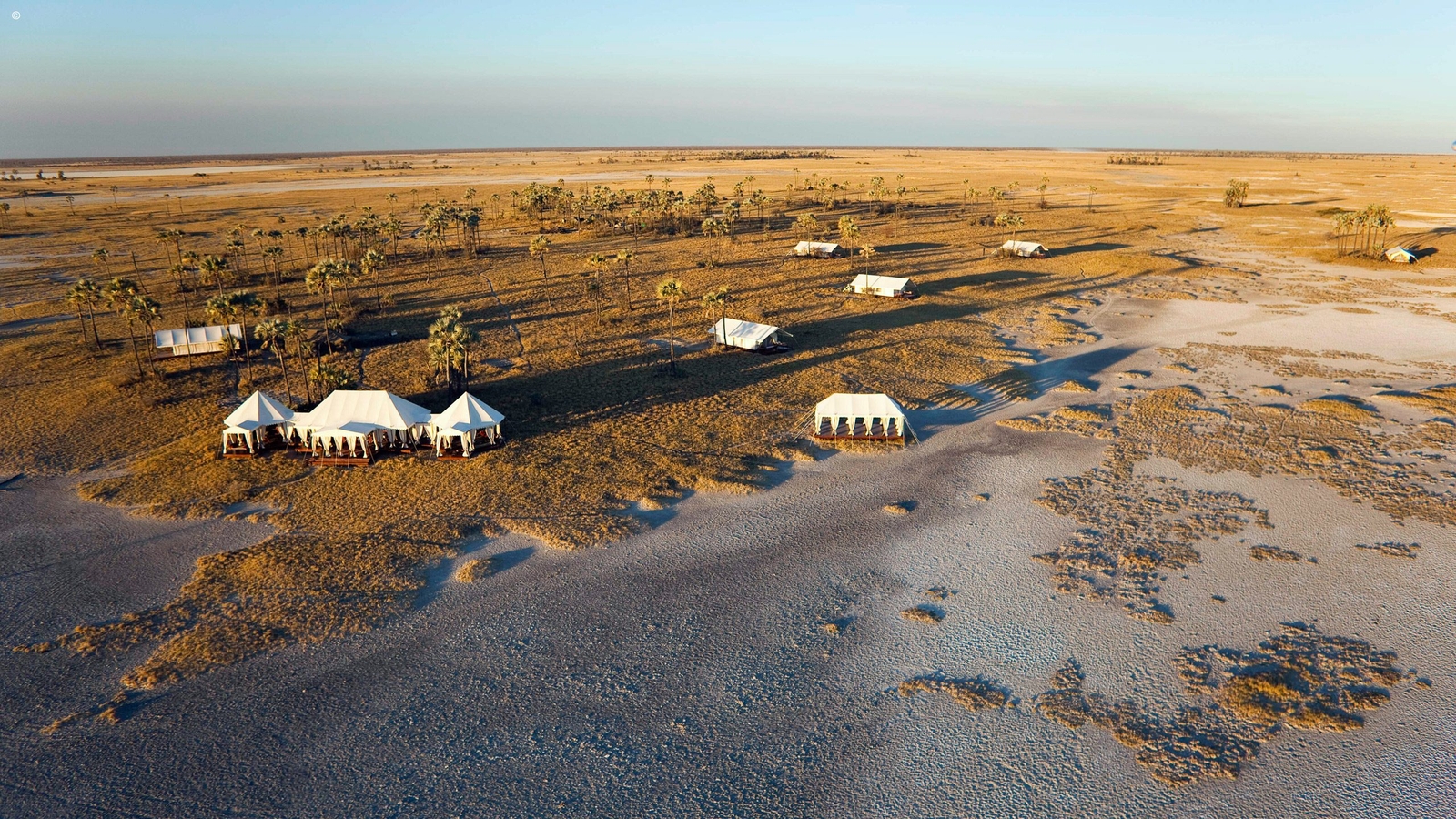 The camp itself mirrors the simplicity and open spaces of the pans. Six elegant spacious pavilion style tents sit each under a cluster of tall palms. Period style pieces adorn the interiors with lovely wooden chests, boxes and brass fittings about. Bathrooms are equipped with bucket showers and a flush toilet. The rooms are lit by the warm glow of old-fashioned spirit lamps.