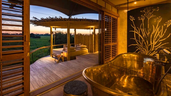 As with many stunning camps in the Delta, there’s no compromise on wild, exclusive safari experiences either. This camp in Moremi Game Reserve is perfect for honeymooners looking for a one-of-a-kind property on their romantic safari.